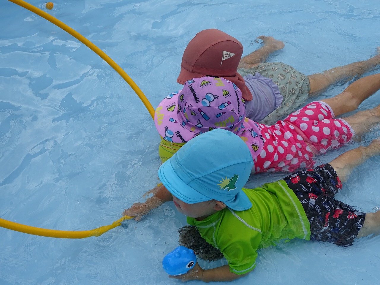 天気がよく全身水につかっても水の冷たさが心地よくプールあそびには丁度良い日になりました。1歳児の子どもたちは、初めビニールプールで遊んでいましたが、水に慣れてきたら大きいプールににも入ることができ、水の感触を楽しむことができました。2歳児の子どもたちは、未満児の子どもたちのダイナミックに遊ぶ様子に刺激を受け真似てやってみようとする姿がありました。
