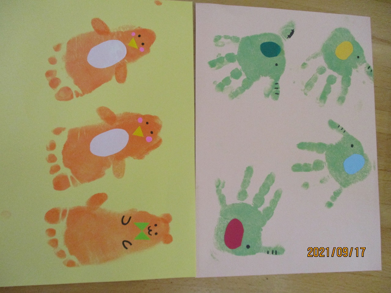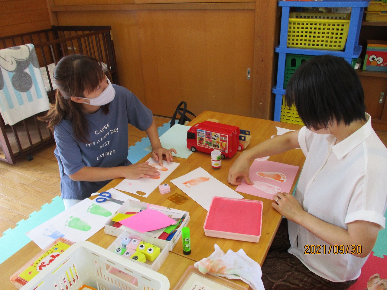 手形足形をスタンプで押して(うさぎ、くま、りす、カエル、ぞう、くじゃく)などの動物に変身させ、台紙に貼り写真やメッセージを添えてプレゼントを作りました。スタンプを押すことを嫌がることもなく色々な色で押し綺麗な手形足形を押すことができました。また、動物以外に車やバイクも手形足形できるよと考えてみえアイディアいっぱいの作品を完成させるお母さんもみえました。そして、祖父母へプレゼントしたらすごく喜ばれたというお話も聞け良かったです。