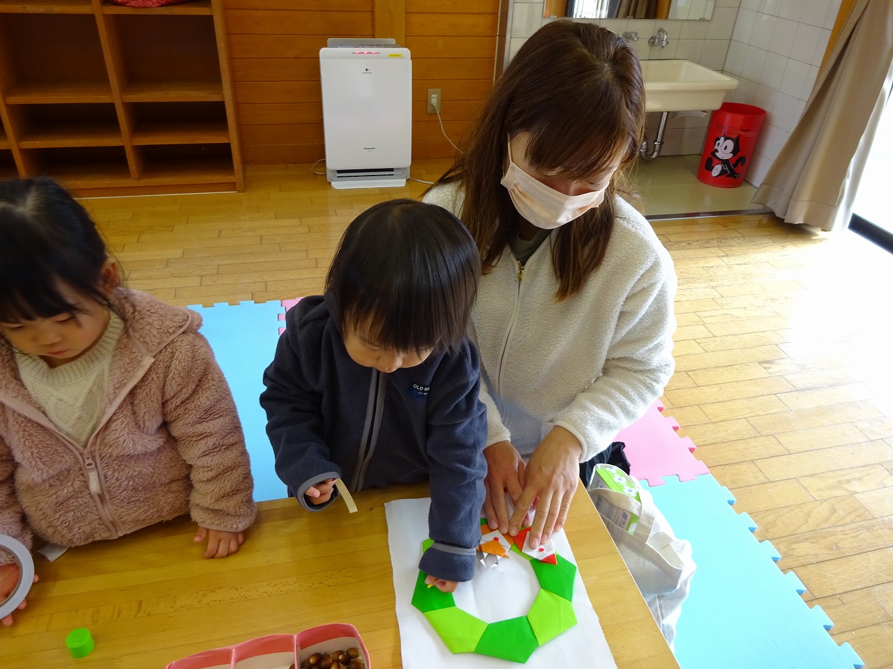 折り紙で折ったリースに飾り付けをしてクリスマスリース製作を行いました。
