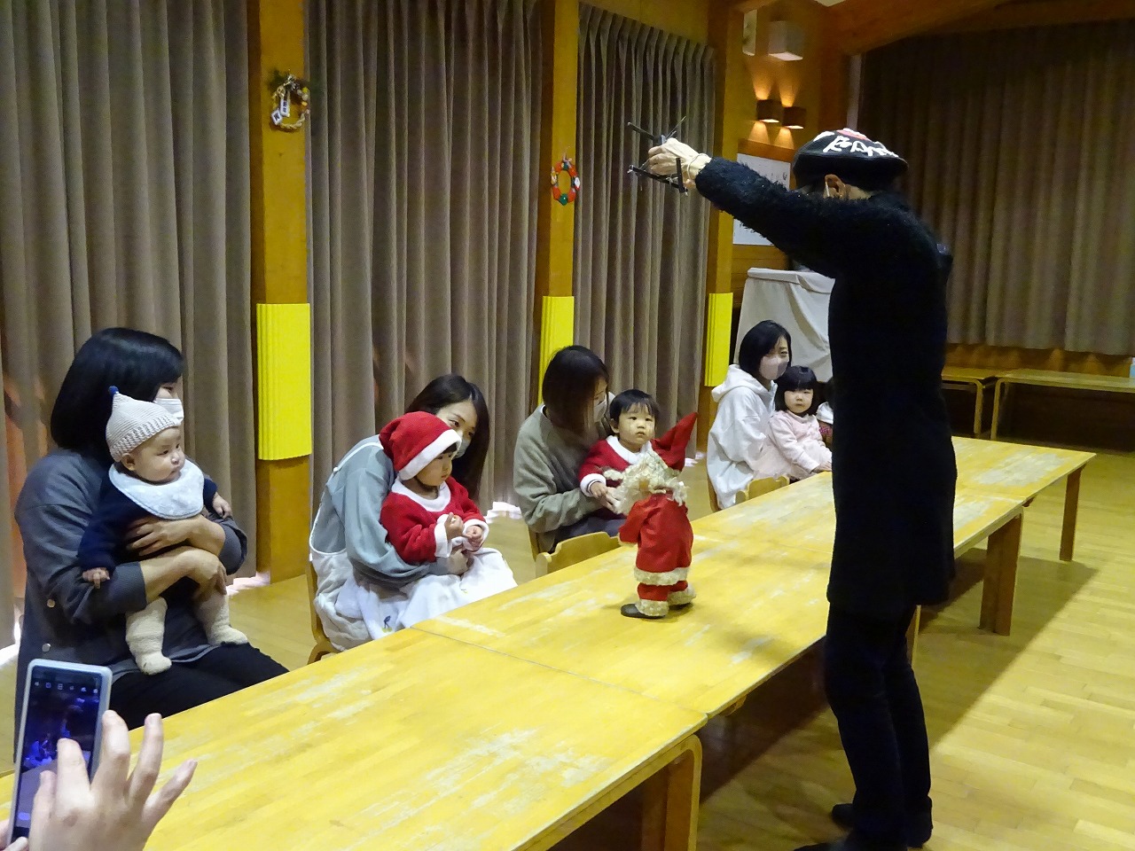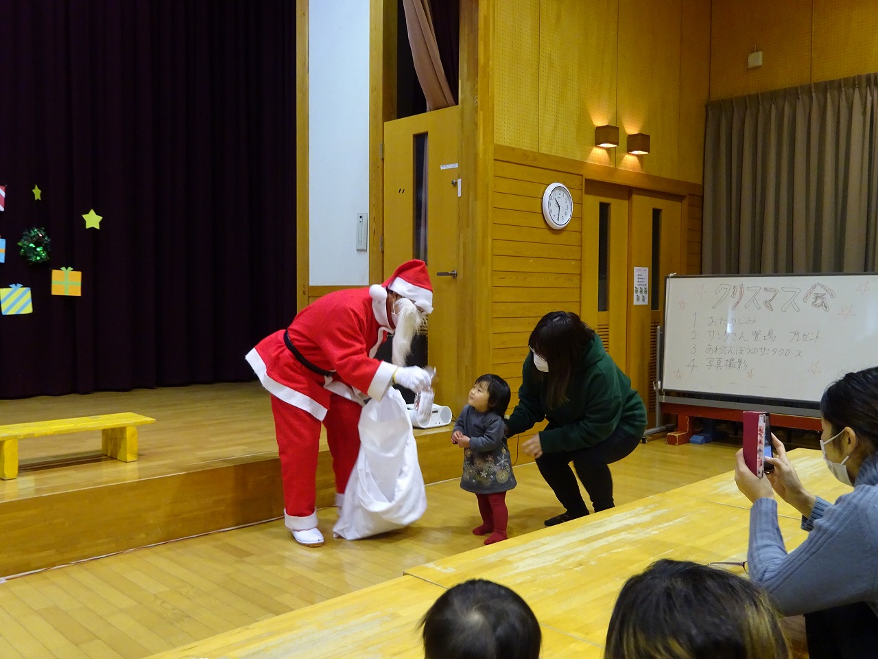 最後に「あわてんぼうのサンタクロース」の歌に合わせて、プレゼントの鈴を鳴らしステージの上でサンタさんと一緒にうたったり、お母さんの側で体を揺らして楽しんでいました。とても楽しいクリスマス会となりました。