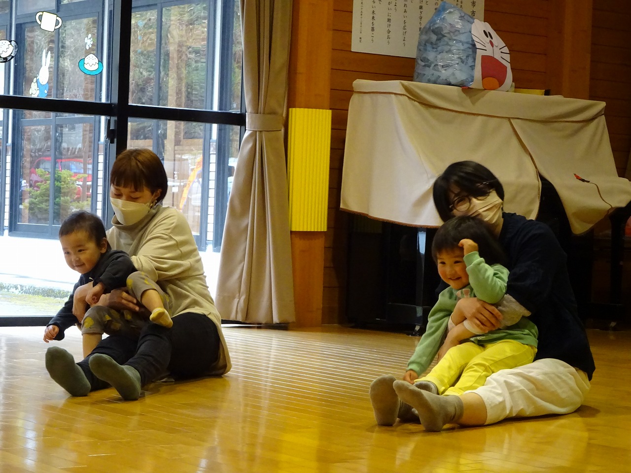 さんぽの曲に合わせて手をつないでゆっくり歩き、「反対だよ」の声にもさっと向きをかえて歩くことができました。次は座って手遊びを行い、バスにのってでは右、左、などお母さんの足の上で楽しむことができました。