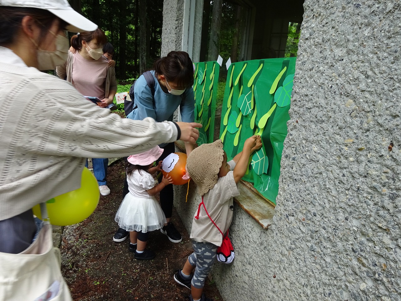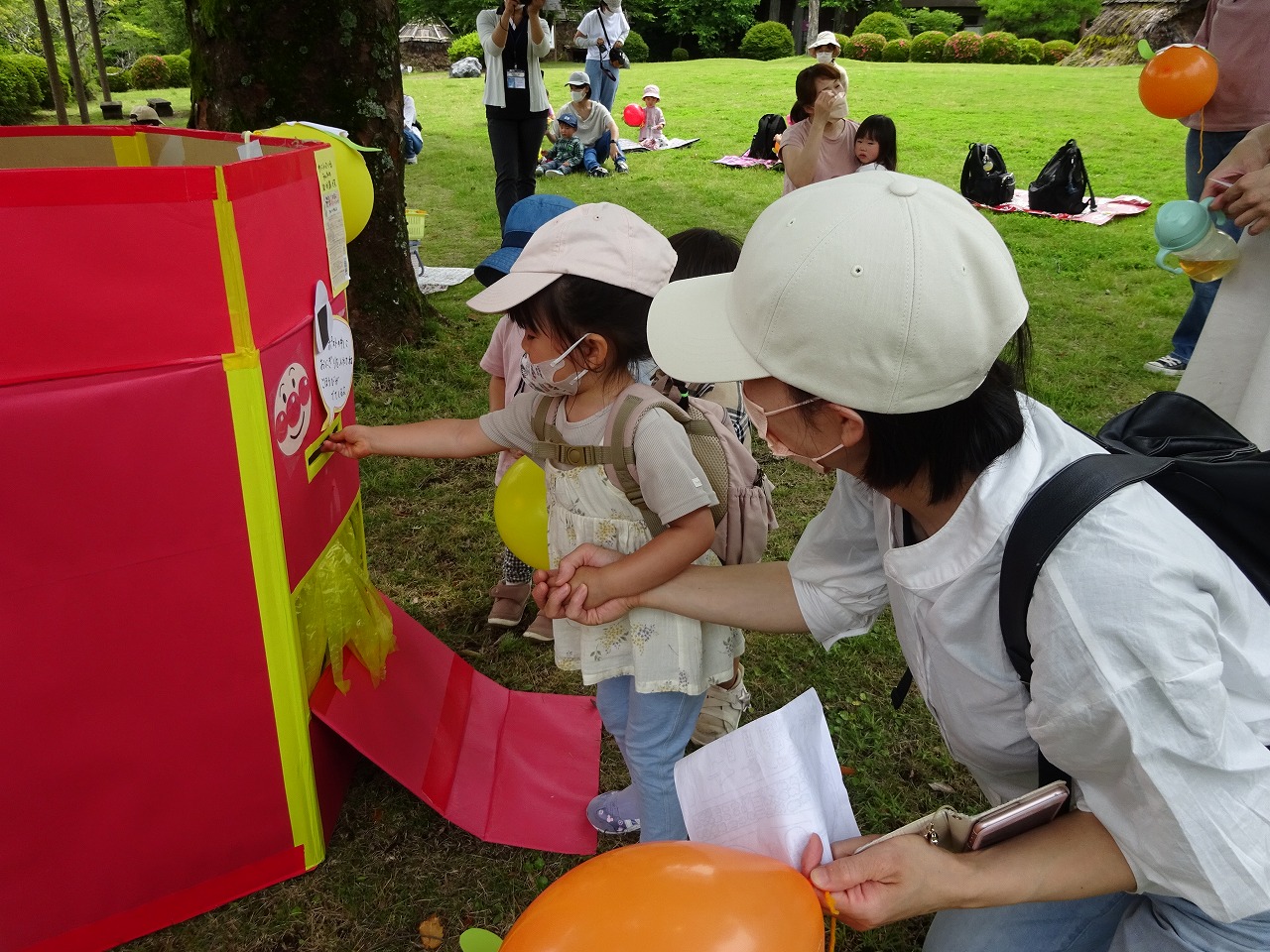 天候が心配されましたが、曇り空から薄日が差しウォークラリーには丁度良い日となり、15組の親子の参加がありました。縄文公園マップを見ながら9ヶ所を回ってもらい、初めにアンパンマンの券を入れると鯉のエサが出てきて池へ行きエサをあげました。そして、風船をもらってウォークラリーして行くとワンワンの顔になりました。途中で割れてしまうハプニングもありましたが、子どもたちは楽しく参加することができました。