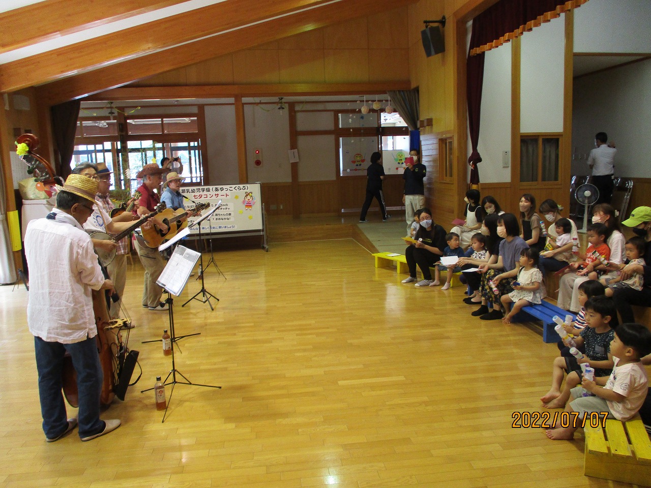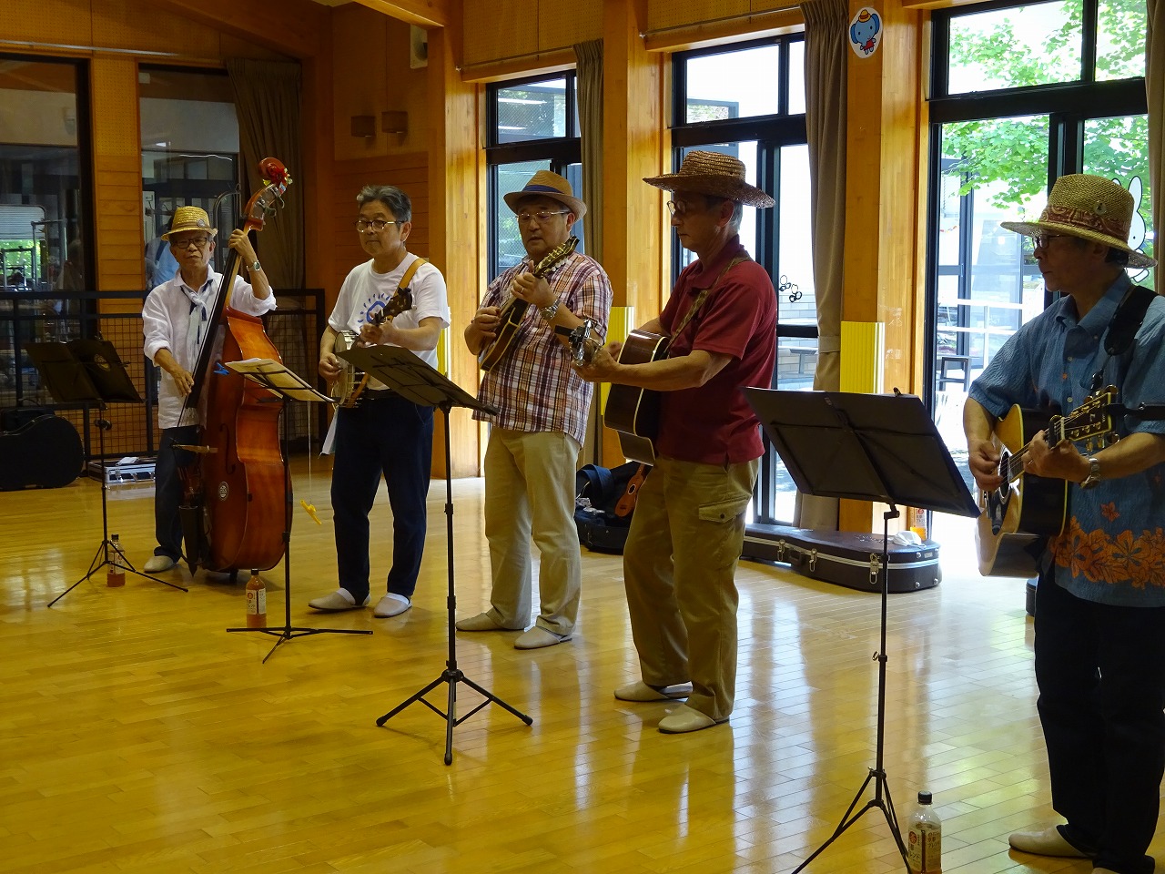 七夕飾り製作を行い笹に飾った後、下呂市内全域でライブ活動を行っているフォークバンドGoo連帯、ステキなおじさまグループに七夕コンサートとして季節の曲、Goo連帯のオリジナル曲を演奏してもらいマラカスでリズムを取りながら一緒に唄って楽しみました。