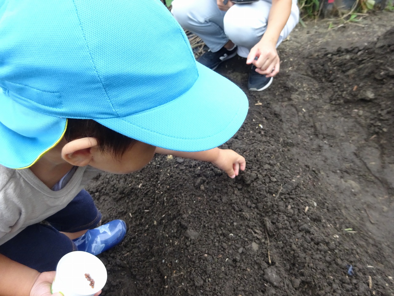 3組の親子と未満児の子どもたちで行い、初めに種のまき方を教えてもらいました。 小さな種を少しの間隔をあけてまくのは大変でしたが、子どもたちは1粒ずつもらってまいてくれました。 丸大根も長大根も3列ずつまくことができ、芽が出てくるのが楽しみです。土をやさしくかけてからペットボトルに水を入れたっぷりかけてあげることができました。