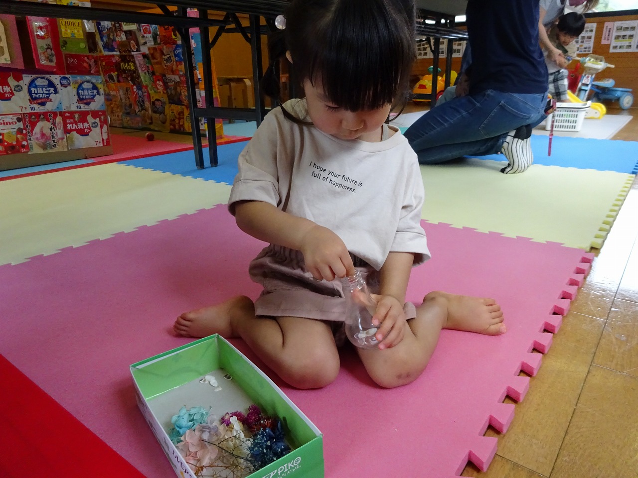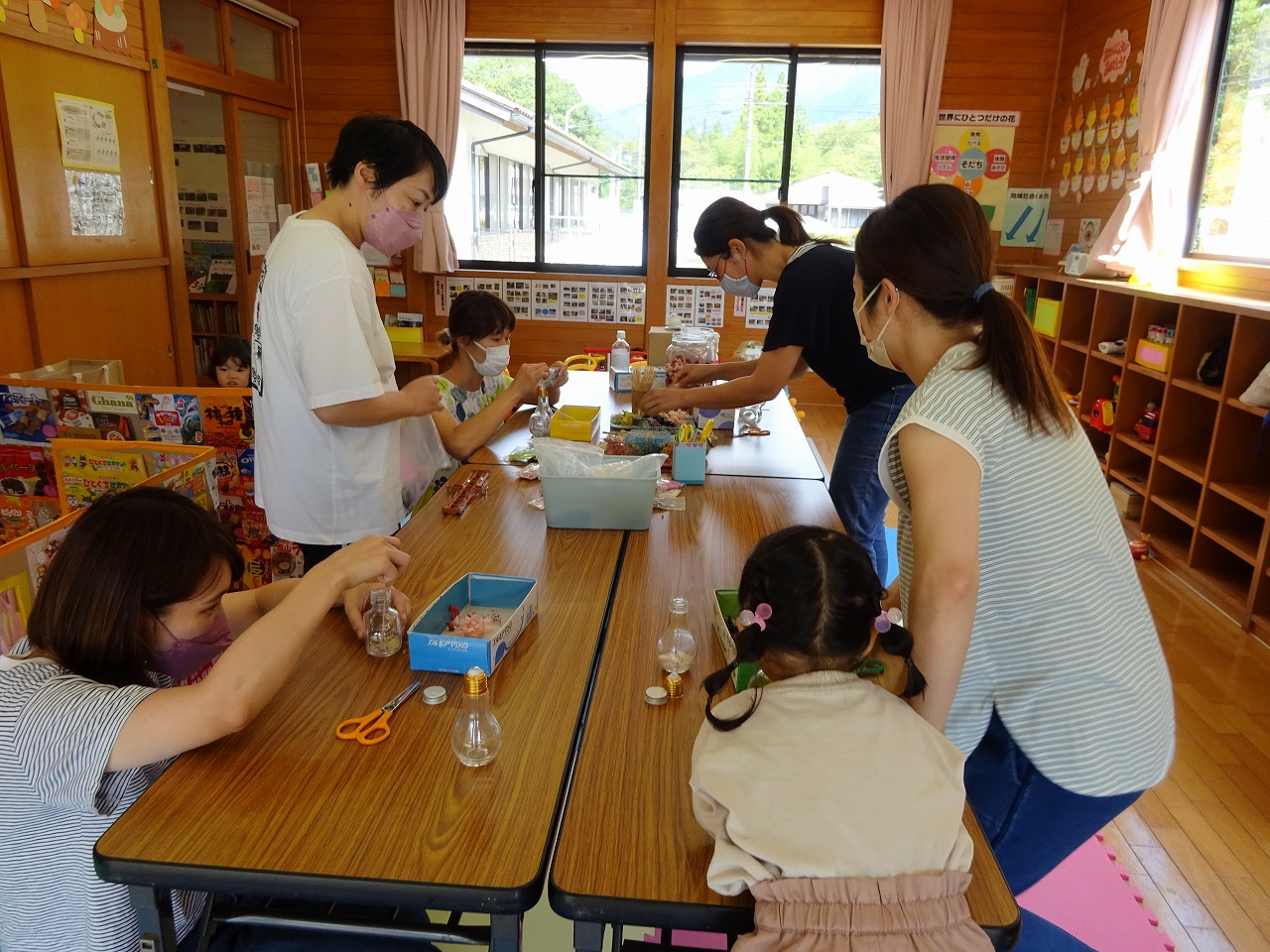 ハーバリュームを作るこたが初めてのお母さん方でしたが、入れたい材料を決めるのも早く色の工夫をしながら楽しんで製作をすることができました。女の子は貝殻や花など小瓶に入れて、おじいちゃんおばあちゃんへのプレゼントを理解して一緒に製作を楽しんでいました。人数が少なかったこともあり、1組2個製作してもらうことができました。ラッピングもしてプレゼントするのが楽しみな様子でした。