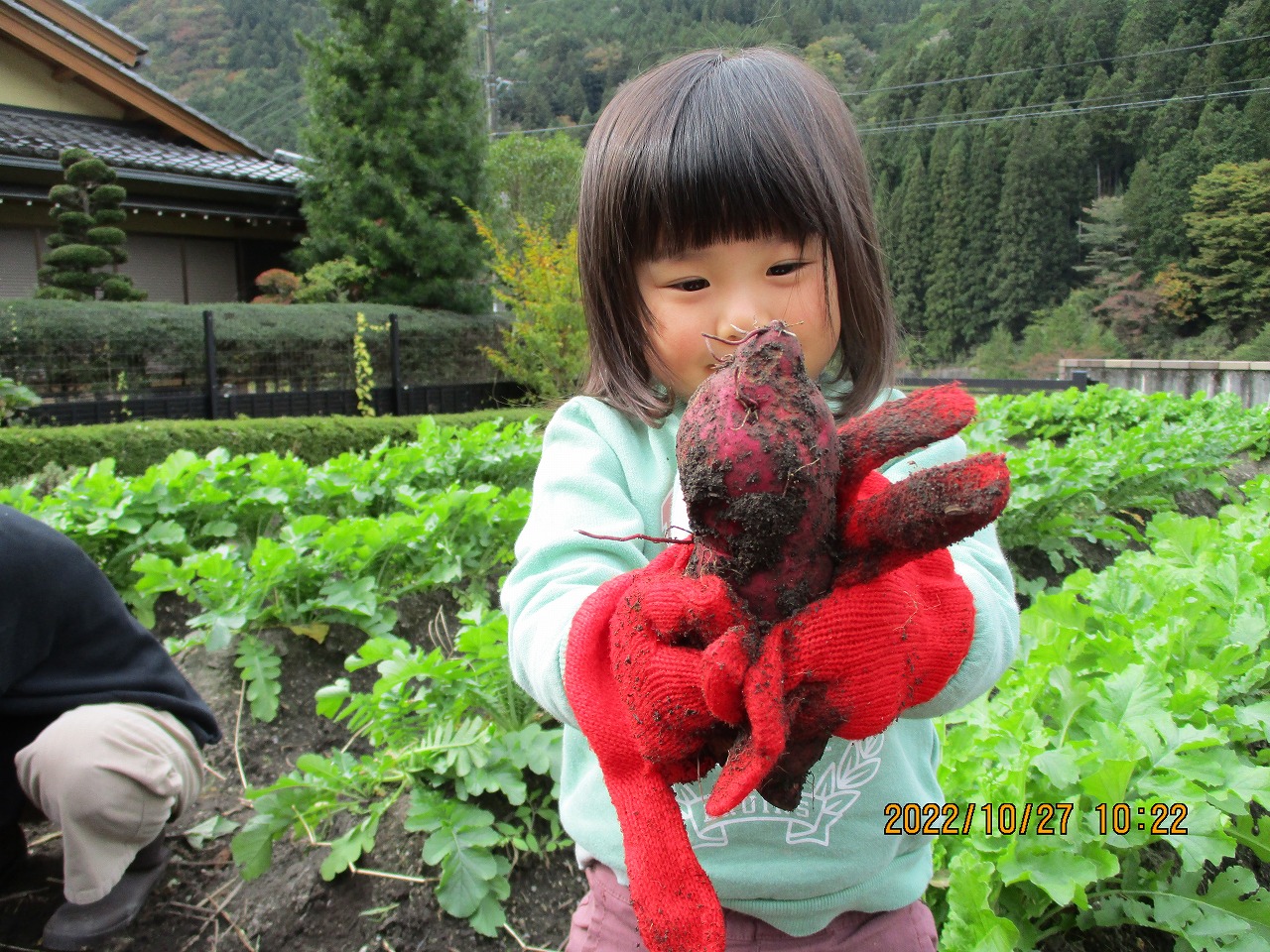 3組ずつ畝に入ってもらい蔓を引っ張り、次々に出てくるさつま芋に喜びの歓声があがりました。大きいお芋がついていて何か所か掘り出す体験をしてもらうことができて良かったです。大中小を選び3つ持って帰ってもらいました。味わった感想をまた聞いてみたいと思います。