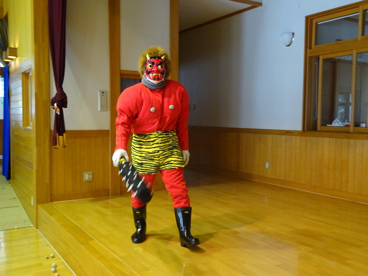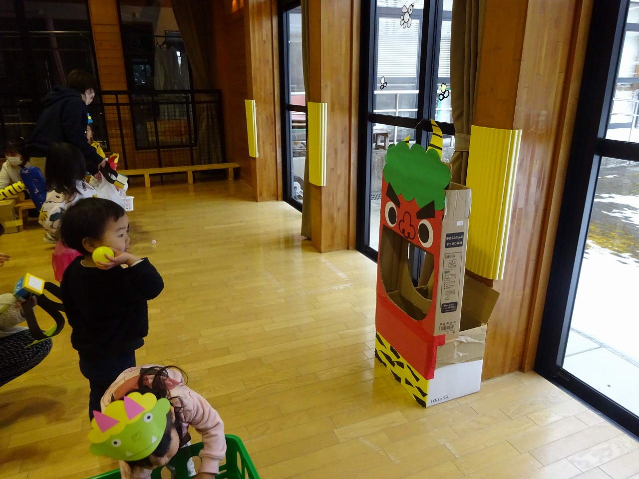 12組の親子が参加してくれました。遊戯室のコーナーあそびを楽しんでいるとドンドンと音がして赤鬼が登場。 怖くて泣く子が多かったです。「優しい鬼さんだよ」と伝えると少し安心したのか写真撮影することができました。お母さんの感想では鬼が本格的でびっくりした。お面・豆箱が可愛かった。貴重な体験、来年も参加したいなど、子どもたちは大泣きだったが良かったという感想が多かったです。