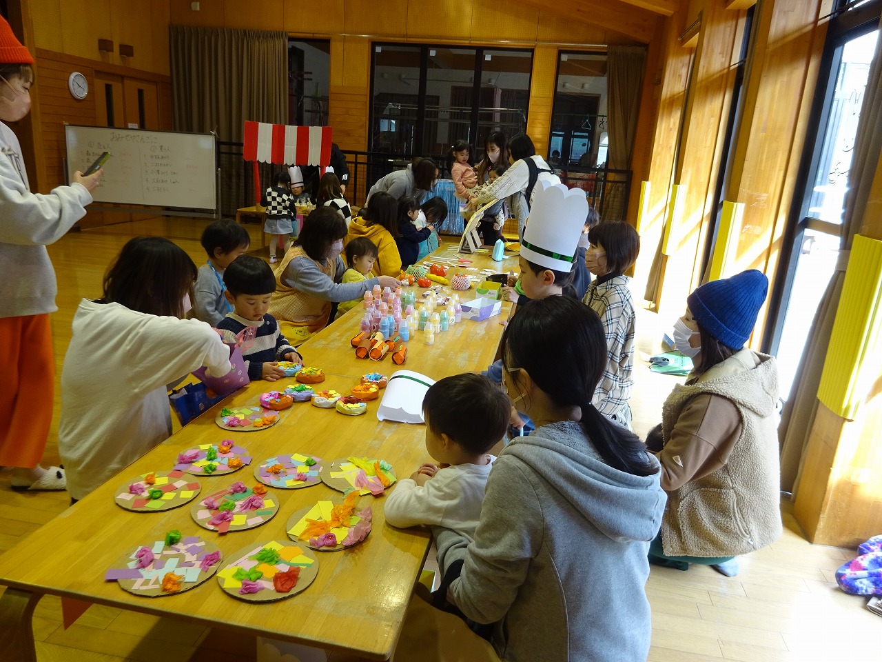 11組参加がありました。パン屋さん、おもちゃ屋さん、くだもの屋さん、ポップコーン屋さんの4つのお店の売る人はくじ引きで決め、値段は各自好きなように決めてもらいました。「いらっしゃいませ」「100円です」と年少に上がる子どもたちは上手に言えお金のやり取りもとても上手でした。また、自分の財布からお金を出すお釣りをもらうのも嬉しい様子でした。看板つくりや品物作りを園児の子どもたちにも手伝ってもらったおかげで盛大なお店屋さんごっこができました。