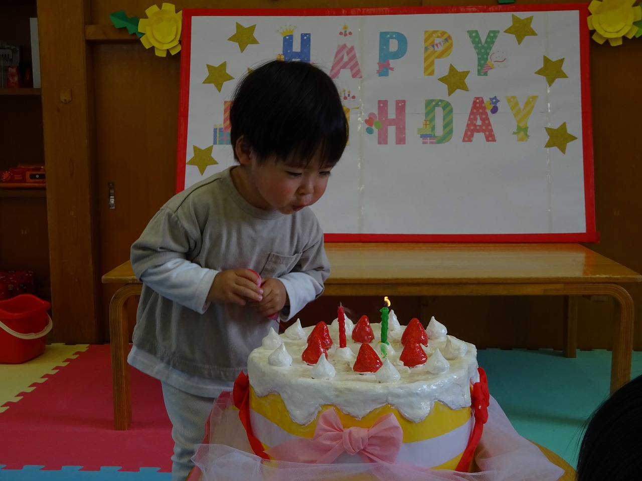 2組3人とうさぎ組の子どもたちも参加してお祝いしました。 3歳になった子は上手にロウソクを吹き消し身長、体重も測ることができました。 お楽しみは「おおかみくんはなぜ元気」のエプロンシアターを行い おおかみくんの口の中へ食べ物を入れることを楽しみました。久しぶりに賑やかなたんじょうかいでした。