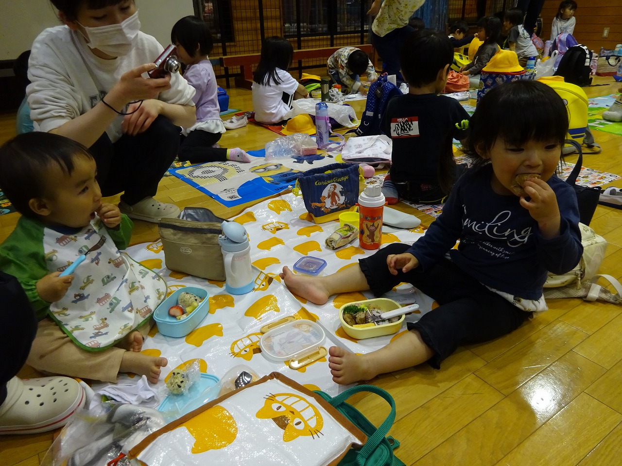 遊戯室で貨物列車に仲間してもらったり、お菓子つかみ競争にも参加させてもらいました。 遊戯室でのサーキットあそびやバスの部屋、支援センターでの遊びにも参加して楽しい時間を過ごしました。 お弁当も遊戯室で一緒に食べ、賑やかに愛情いっぱいのお弁当を美味しくいただきました。