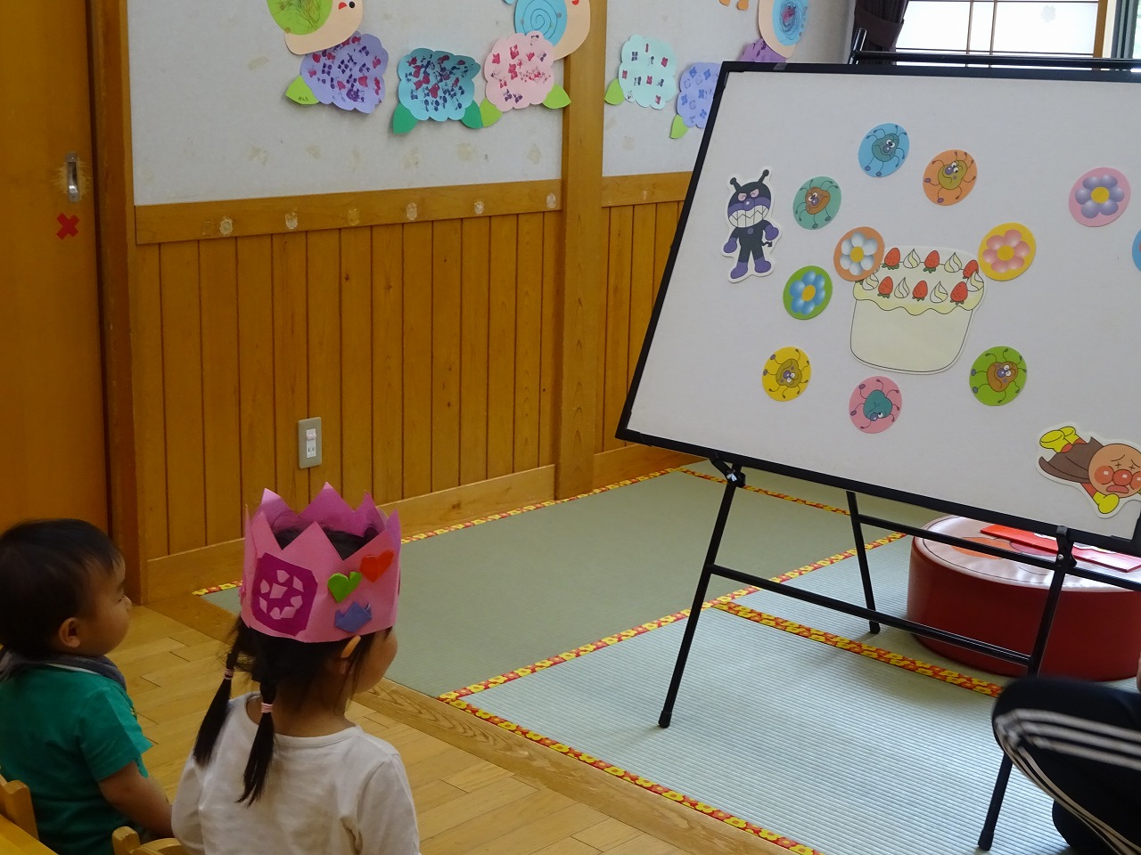 冠をかぶってにこにこでインタビューに答えてくれ、ケーキのロウソクも上手に吹き消すことができました。 今年度は2人のうさぎ組さん プレゼントを上手に渡してくれました。お楽しみは「アンパンマンのたんじょうかい」のパネルシアターを行いました。興味津々観ることができ、楽しい誕生会でお祝いすることができました。