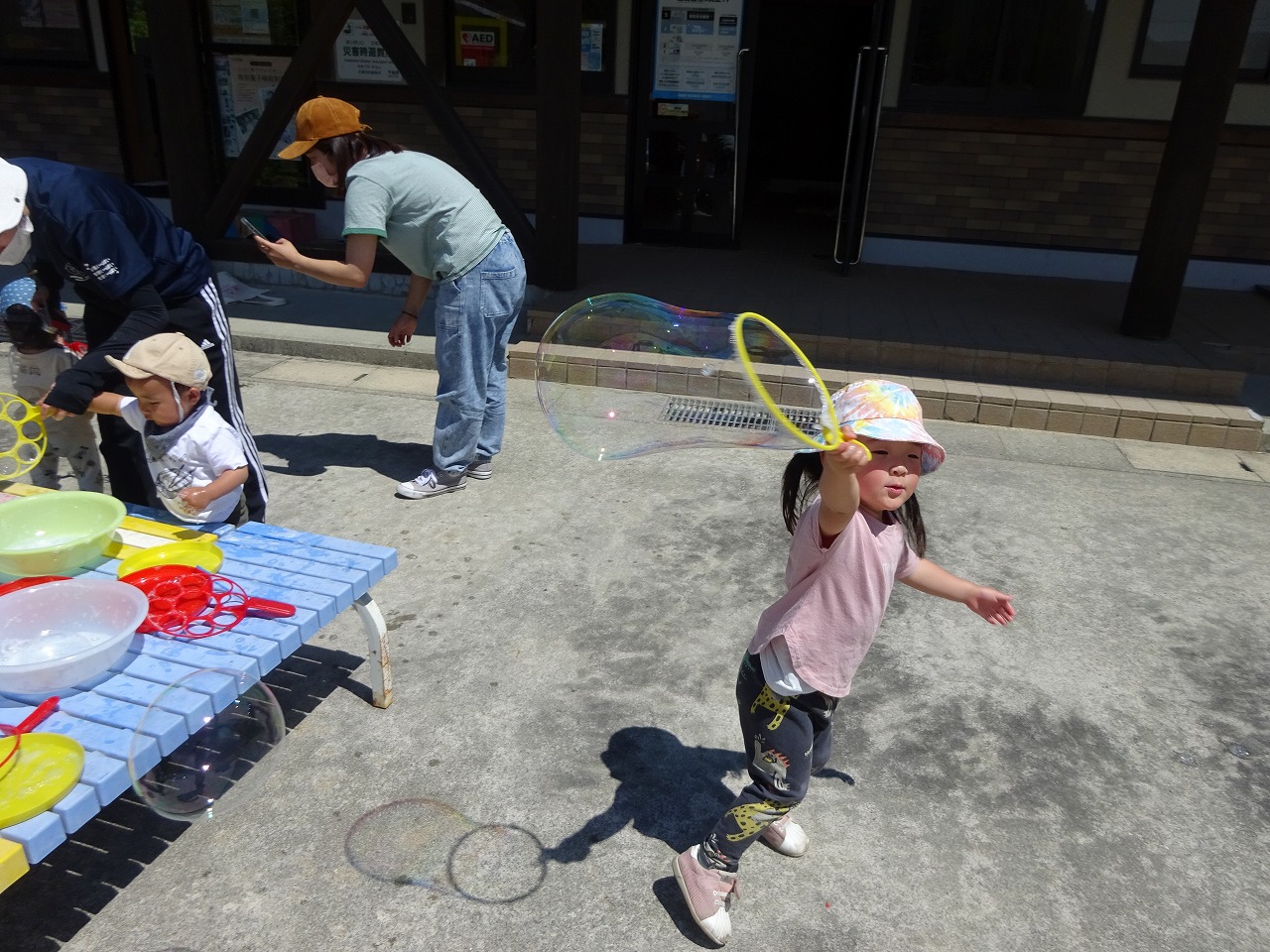 うさぎ組の子どもたちが行う予定にしていたので親子の方々も誘いました。5組の親子が参加してくれました。 最初は、上手くしゃぼん玉が作れなかった子どもたちでしたが、3歳の子どもたちは口で吹いたり、道具を使って徐々にコツをつかみしゃぼん玉ができてきました。市販のしゃぼん玉液よりも洗たく糊、洗剤、水を混ぜたしゃぼん玉液の方が大きいしゃぼん玉ができて子どもたちは大喜びでした。