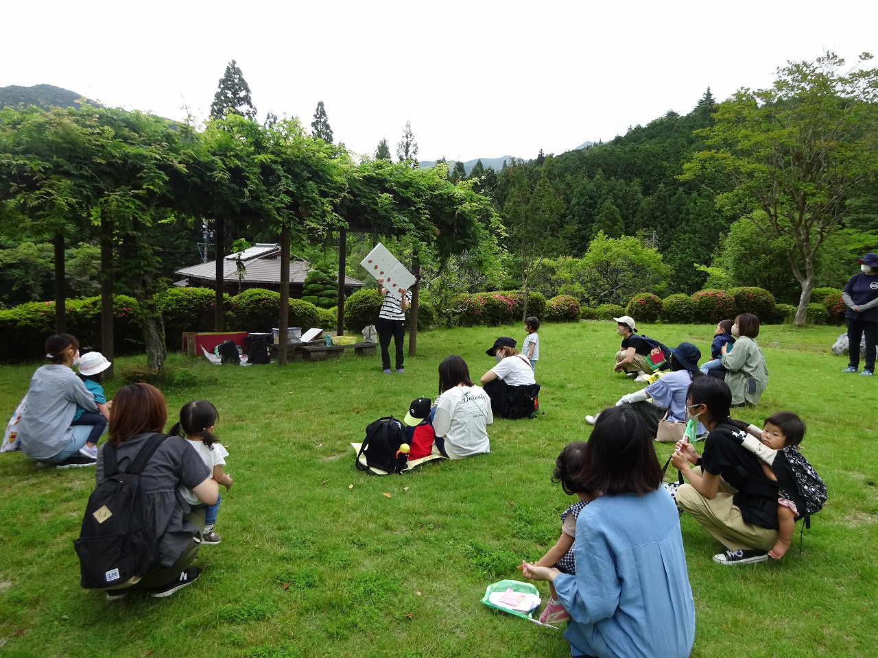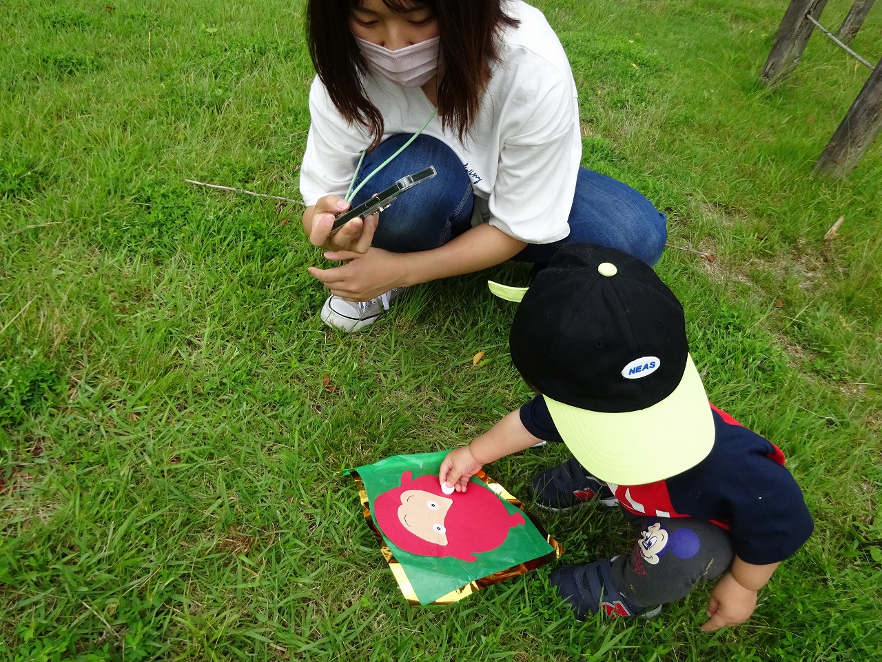 縄文公園の地図とアンパンマンカードを持って出発し全員の子どもたちが自動販売機にカードを入れて鯉のエサをもらい鯉にエサをあげることができました。エサの後は、旗をもらって「だるまさんウォクラリー」の始まりです。体、顔、目、ほっぺ、口と順番に貼り、みんな可愛いだるまさんができあがりました。最後は「だるまさんと」の大型絵本。体を揺らしながら「ぺこっ」「ぽにん」「ぎゅっ」とする子どもたちが可愛く自然の中、楽しむことができとても良かったです。