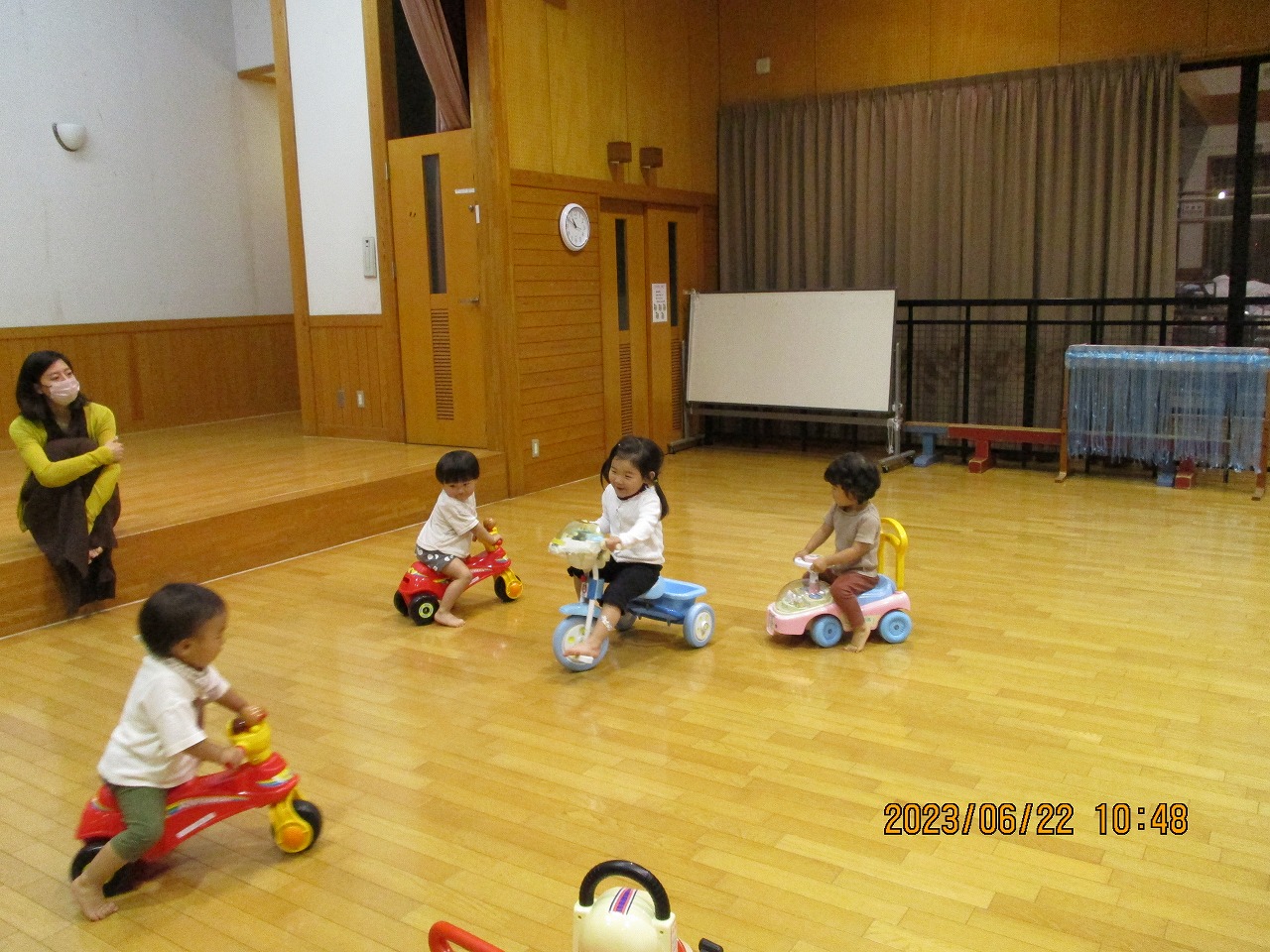 遊戯室にトランポリンや乗り物を準備していたので自由にのびのびと遊びました。