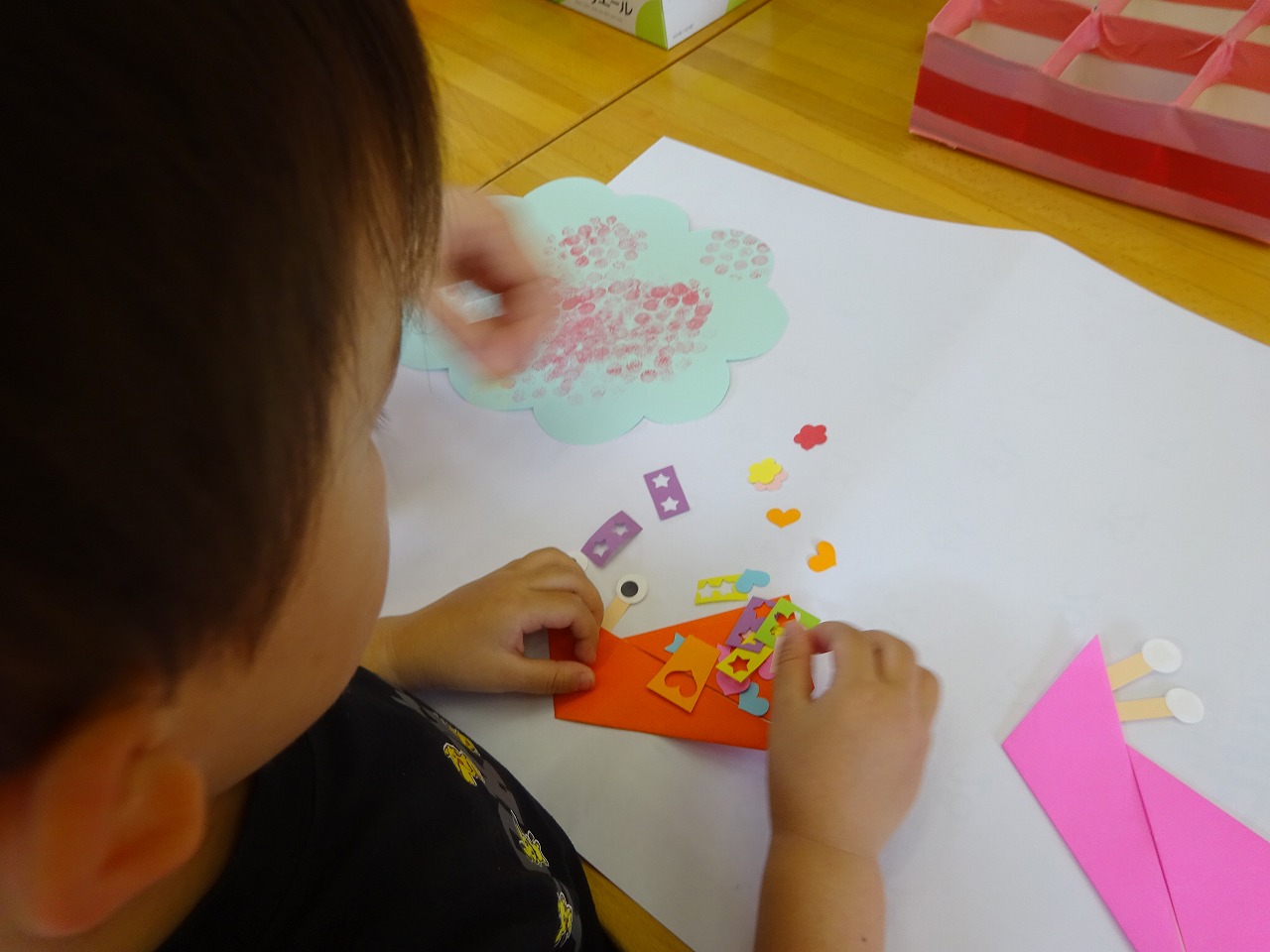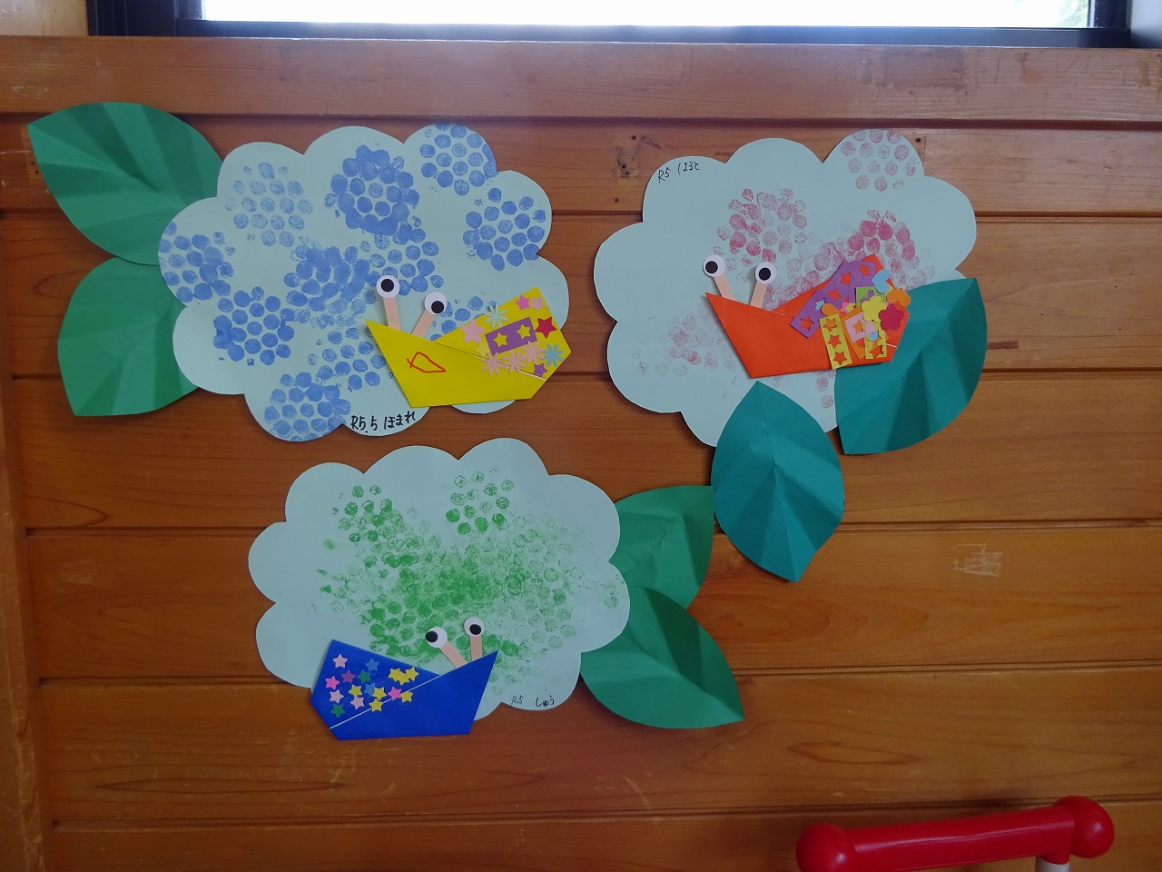 4組の親子とうさぎ組の女の子が作ってくれました。あじさいの花に好きな色を選び「ぺったんぺったん」と押しあじさいの花が完成。かたつむりは目のシールを貼り、体に花や星の形など模様をたくさん飾りました。
