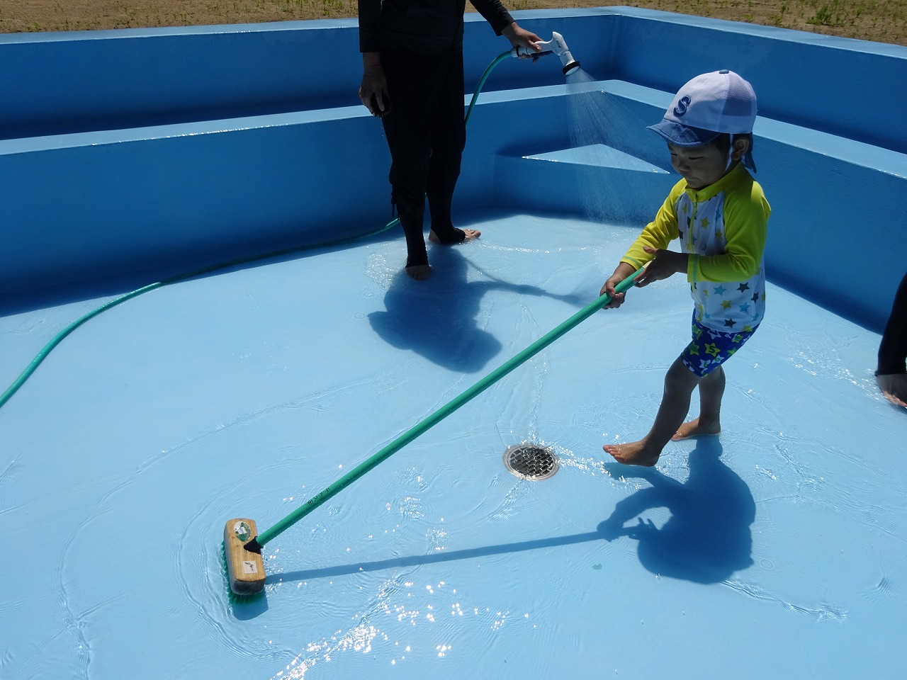 4組の親子とうさぎ組の子どもたち、萩原子育て支援センターの担当者にも手伝ってもらって園児用プールを綺麗に掃除しました。子どもたちはタワシでこすったり、ブラシでゴシゴシとお手伝いをしてくれました。洗い終わった後は、少し水を溜めてプールあそびをしました。暑い日だったので水が心地よく子どもたちの笑顔がたくさん見られました。小さい子どもたちはテントの下に準備してあったビニールプールで水をくんだり、金魚すくいをして水あそびを楽しみました。