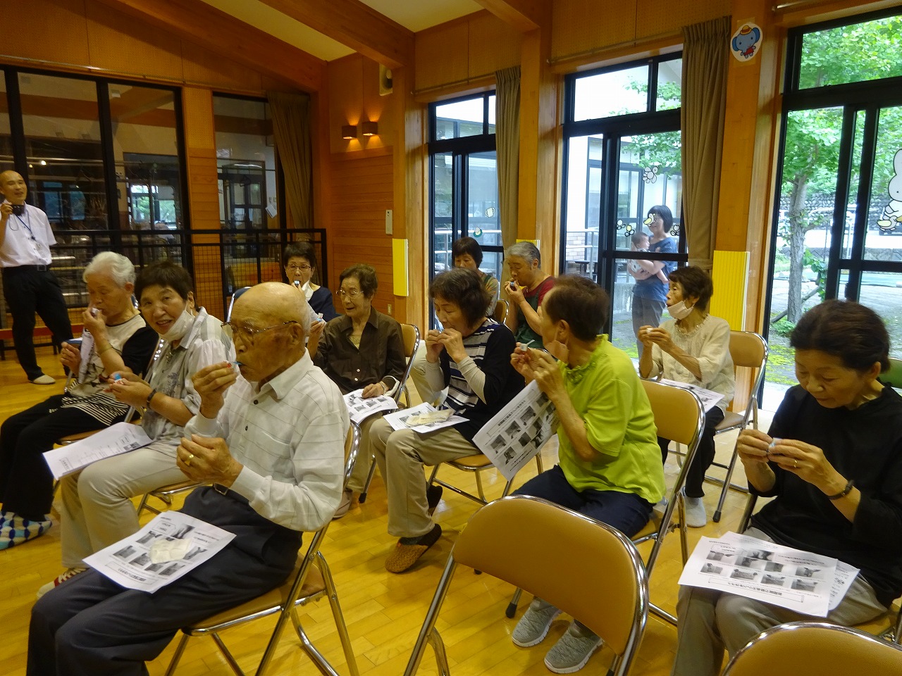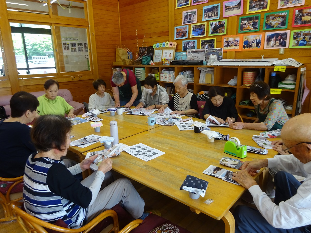 みなさんとても興味をもって聞いて下さり、準備しておくと良い物にはお薬手帳、保険証のコピーを入れておくと良い事や子どものための玩具、絵本なども避難袋に入れておくと良いことなど聞き、うなずいたり、共感したりと有意義な時間でした。牛乳パックでつくったホイッスルやチラシで作ったスリッパにも感心し、お母さん方にはホイッスルを作ってもらい、ほのぼの館の方々は午後からスリッパ作りに挑戦してみえました。お話を聞くと気づいたり考えてみよう、実行してみようと思えるのでとてもよい勉強になりました。