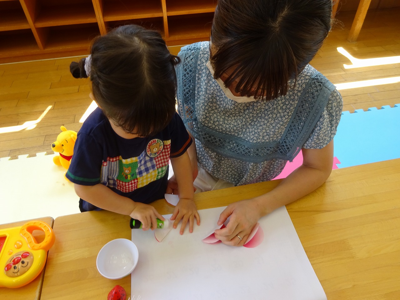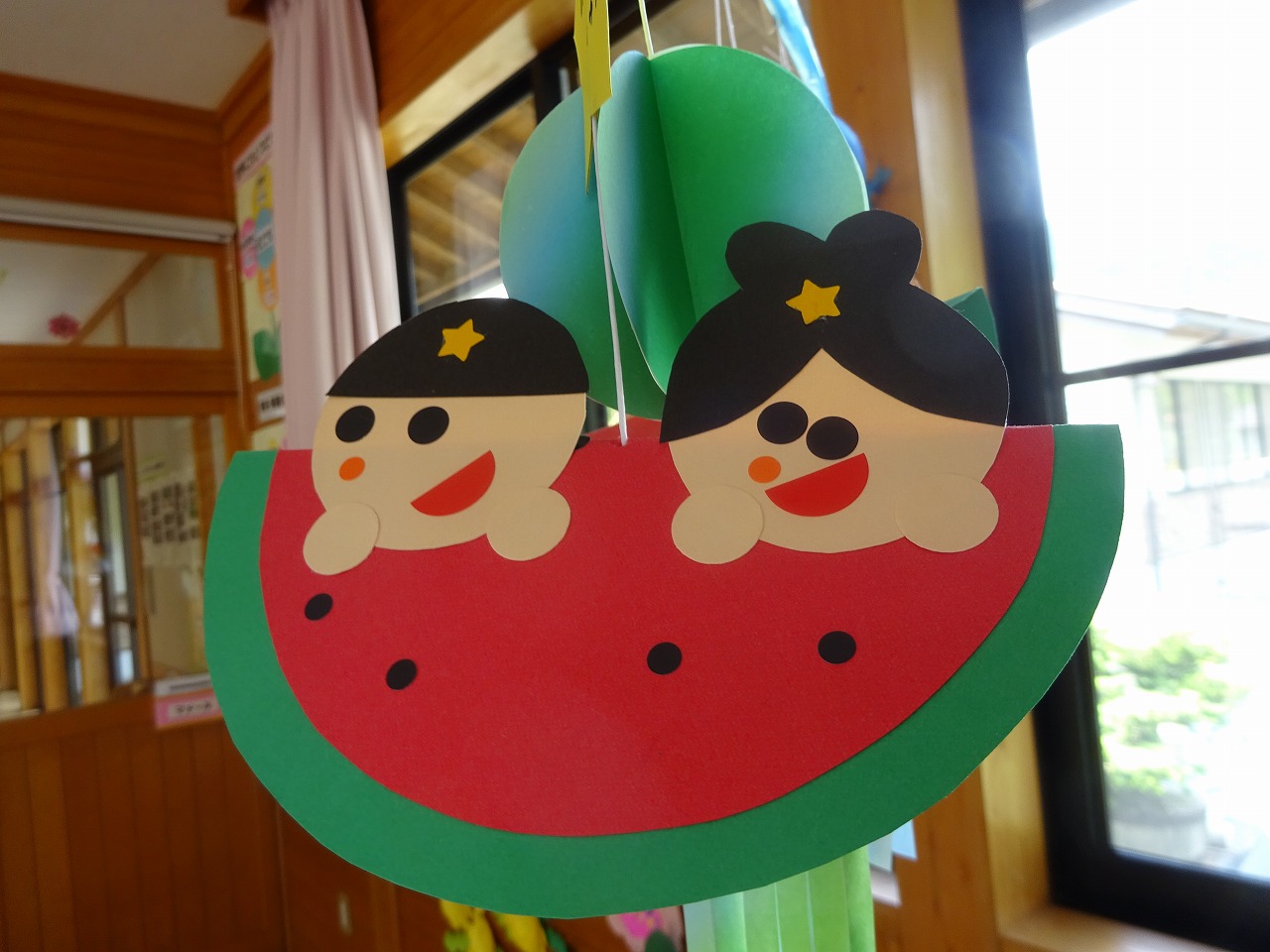 6月26日〜7月4日まで七夕飾り製作を行いました。 細かいシールをスイカの種にして貼りました。小さな手で根気に貼ってくれました。 織姫と彦星の顔もシールで貼り、スイカに乗せて完成です。とても可愛い飾りができました。 立体で涼しげな提灯はお母さんに作ってもらいました。笹に飾り付けるのが楽しみです。