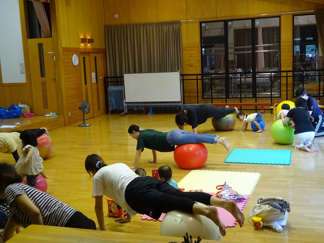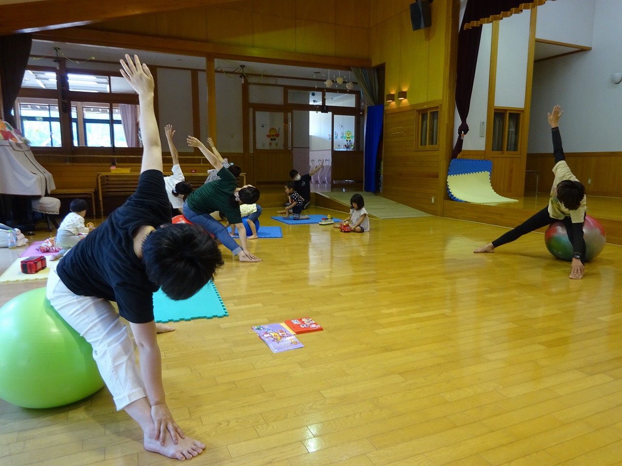 5組の参加があり、一緒にできる子は小さいボールを使って真似て行ったり、ハイハイの子どもたちはお母さんの側で遊びながら、ゆったりと行うことができました。初めてバランスボールを体験された方もみえました。 感想には、久しぶりに体が動かせてすっきりした。曲に合わせてノリノリで楽しめた。リラックスできたなど、楽しかった感想が多かったです。