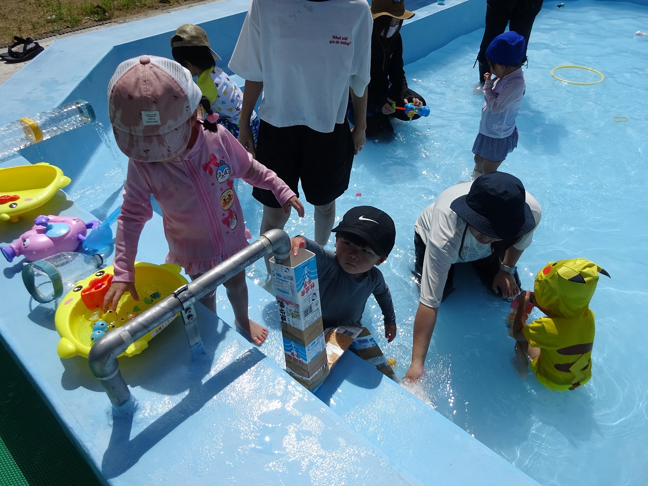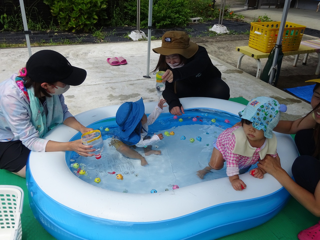 天気が良くプールあそびにはとても良い日でした。園児用プールに入る子が多く大きいプールに慣れてきたように思います。未満児の子どもたちにフラフープにつかまって泳ぐ様子を披露してもらったところ、真似てやってみようとする子もいて全身浸かって楽しむことができました。 今年度は今日で終わりですが、また来年度も園児用プールに入る機会を多くもちたいと思います。