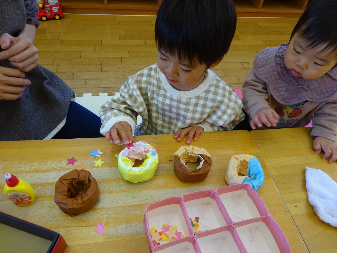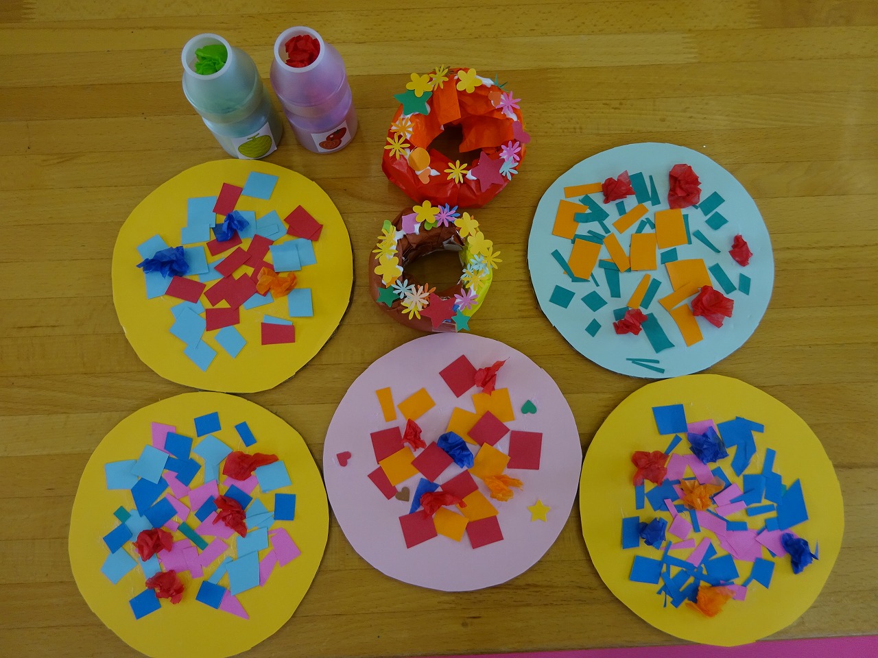ピザは色画用紙をハサミで切って糊で貼り、トッピングでおはながみも付けました。来年年少に上がる子は上手にハサミが使えていました。ドーナツは星、花、ハートなど型抜きした物をトッピングしました。パラパラとかけたり、一枚一枚並べたりと楽しんで製作してくれました。