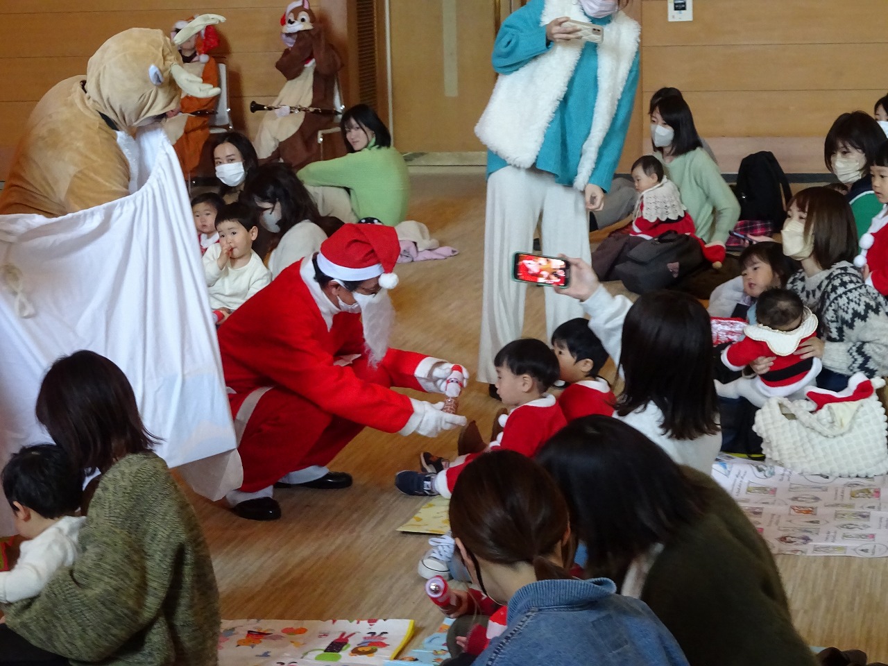 今年度は3拠点の乳幼児学級が合同で星雲会館天慶の間でクリスマス会を行いました。 ピアノ・クラリネットによる素敵な演奏、歌に合わせて大型絵本、赤鼻のトナカイのパネルシアター、サンタクロースからのプレゼントなど盛り沢山の楽しいことがあり、楽しい時間を過ごしてもらうことができました。
