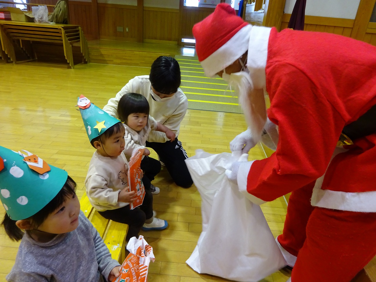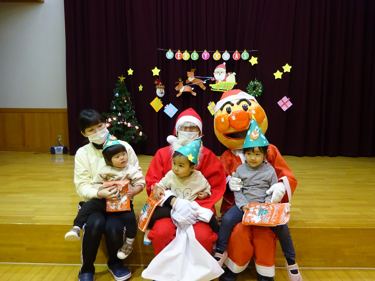 お楽しみは紙皿シアター。紙皿をくるくる回すとツリーやケーキなどクリスマスにちなんだ物が出て来て、次は何かなとワクワクしながら見ることができました。お楽しみが終わると鈴の音が聞こえて来てサンタクロースとアンパンマンが登場しました。泣く子や驚き固まってしまった子どもたちでしたが、プレゼントをもらうと少し安心したようで一緒にあわてんぼうのサンタクロースの歌をうたい楽しいクリスマス会となりました。