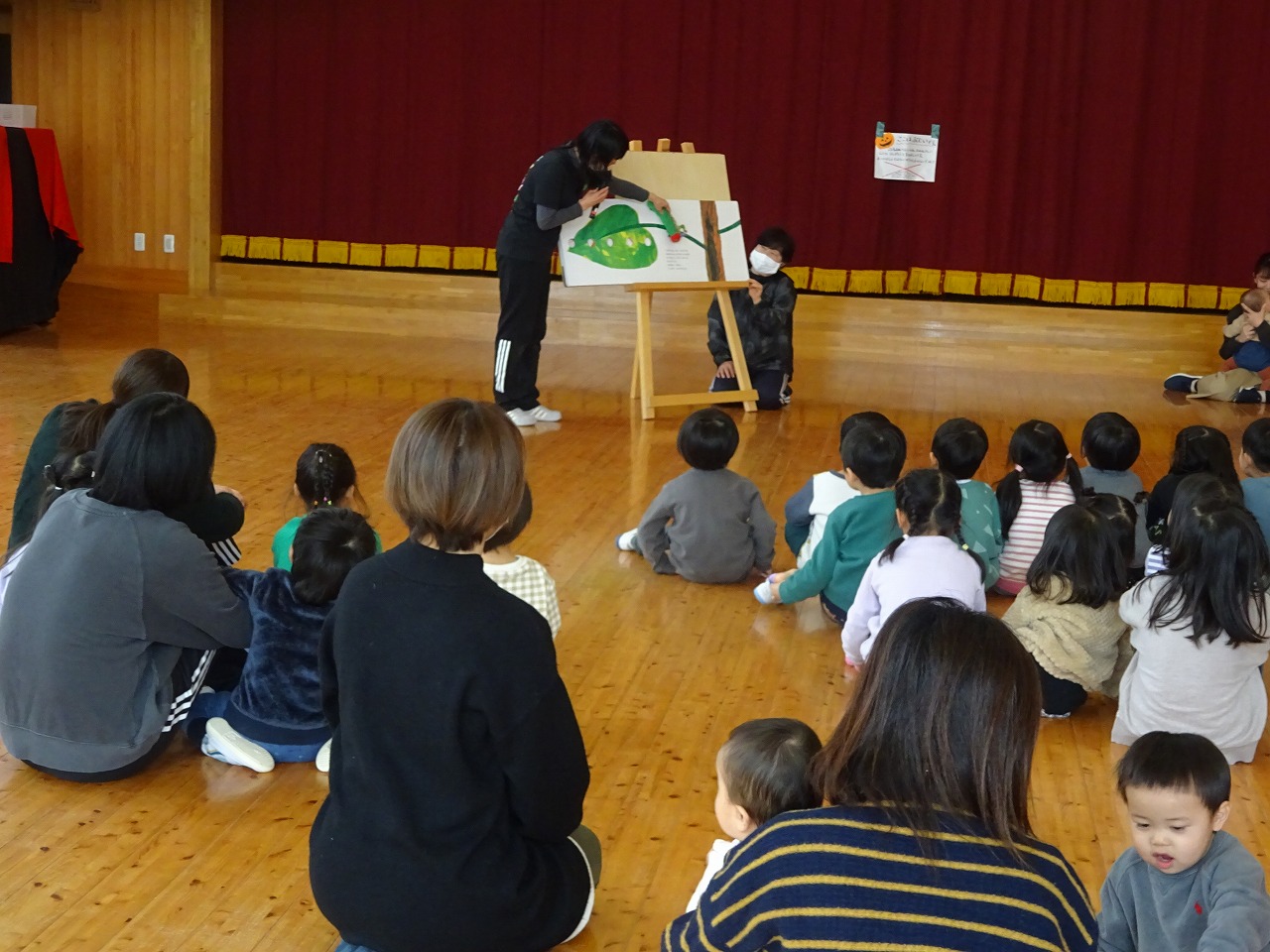 途中、年中のひまわり組の子どもたちが体操とプレゼントを子どもたちにしてくれました。年中の列に交じって一緒に体操をする子どもたちもいてとても可愛かったです。年少に上がるお子さんは年長と年少のペアになるので楽しみですね。最後は「はらぺこあおむし」の大型絵本にあおむしとピアノの効果音も入って園児、子どもたち興味津々観ることができとても良かったです。