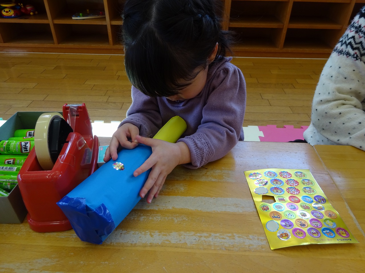 角はお母さんに作ってもらいました。金棒はペットボトルを使用しプチプチの気泡シートを巻いてから画用紙で貼り、子どもたちにシールで飾ってもらいました。出来上がったお面、豆箱、金棒を持ち、鬼のパンツを履いてフォトコーナーで撮影しました。可愛い鬼さんに変身することができました。