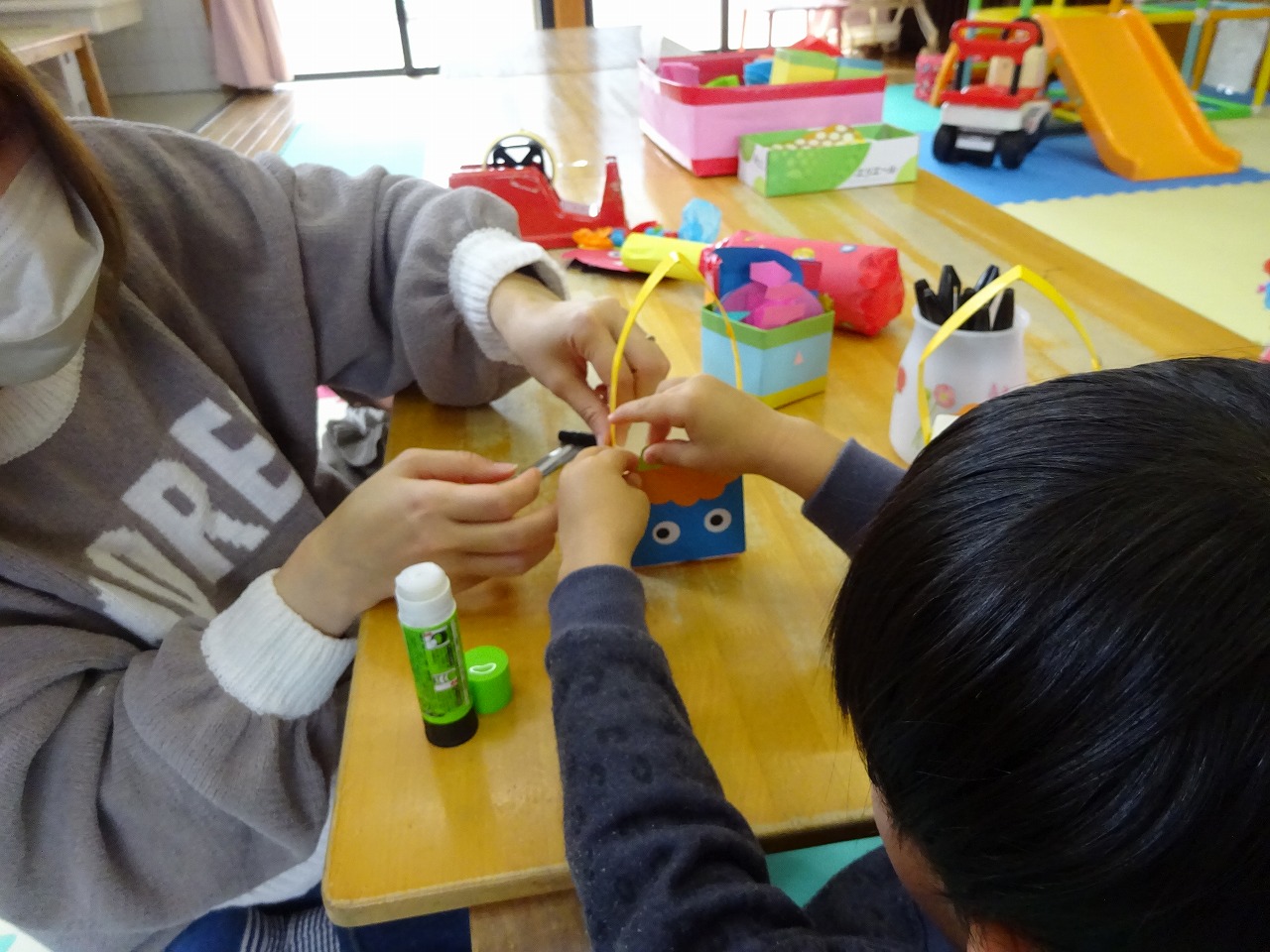6組の参加がありました。お面は(目、角、髪の毛)を子どもたちが貼り、豆箱は(目、髪の毛)は子どもたち