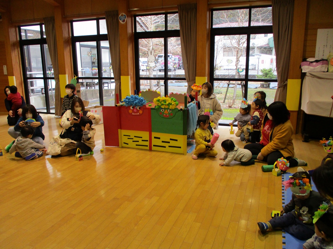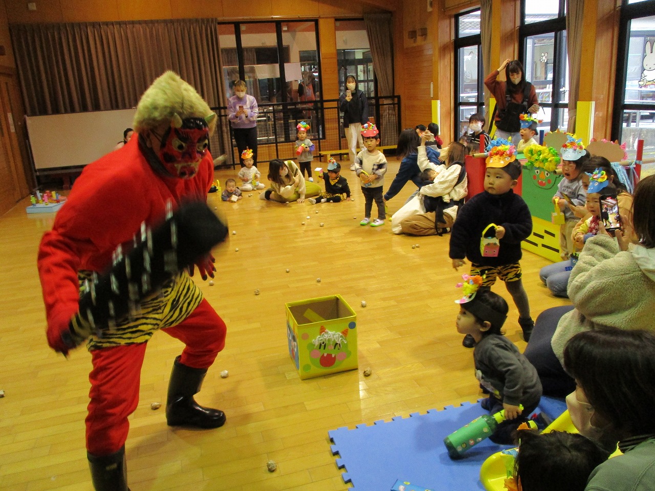 13組の親子とうさぎ組の子どもたちも参加しました。お面と豆箱の製作とコーナーあそびを行い遊んでいる所に赤鬼がステージから登場。子どもたちは赤鬼を見て大泣きでしたが、勇敢に豆を投げる子もいました。 少ししてから優しい鬼さんだよよ伝えることで写真撮影を行うことができました。 怖いけど最後は鬼さんとハイタッチをしてバイバイする子もいて、悪い鬼を追い出すことができました。