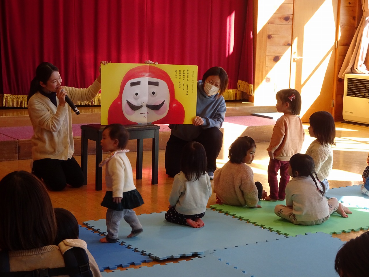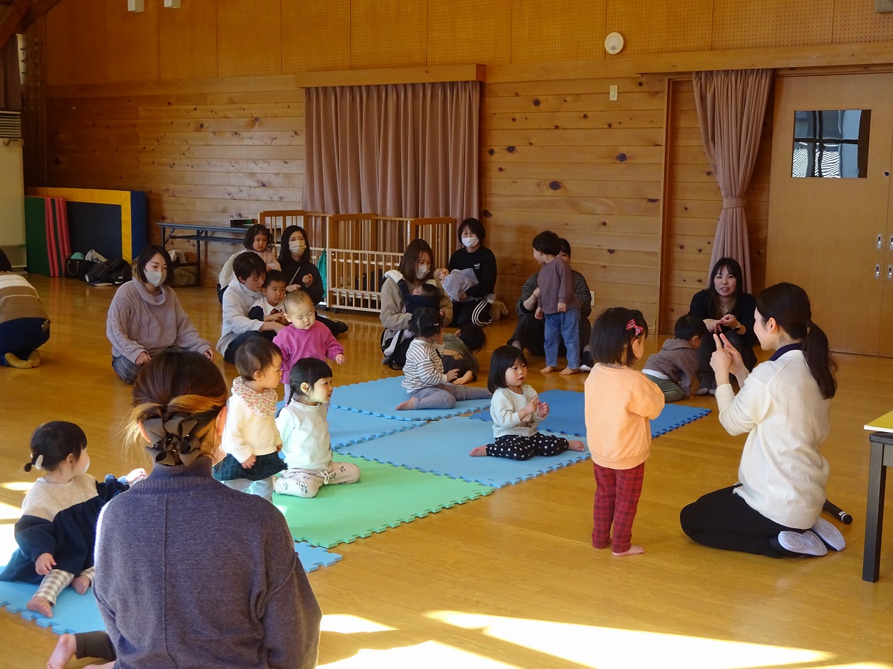 17組の親子が参加してくださり、楽しんで体を動かすことができました。 カラフルなスカーフを使ってひらひらと振ったり、投げたりして思い思いに子どもたちは楽しむことができました。手遊び、大型絵本に興味津々。真似たり、にらめっこして観ることができとても楽しい様子でした。