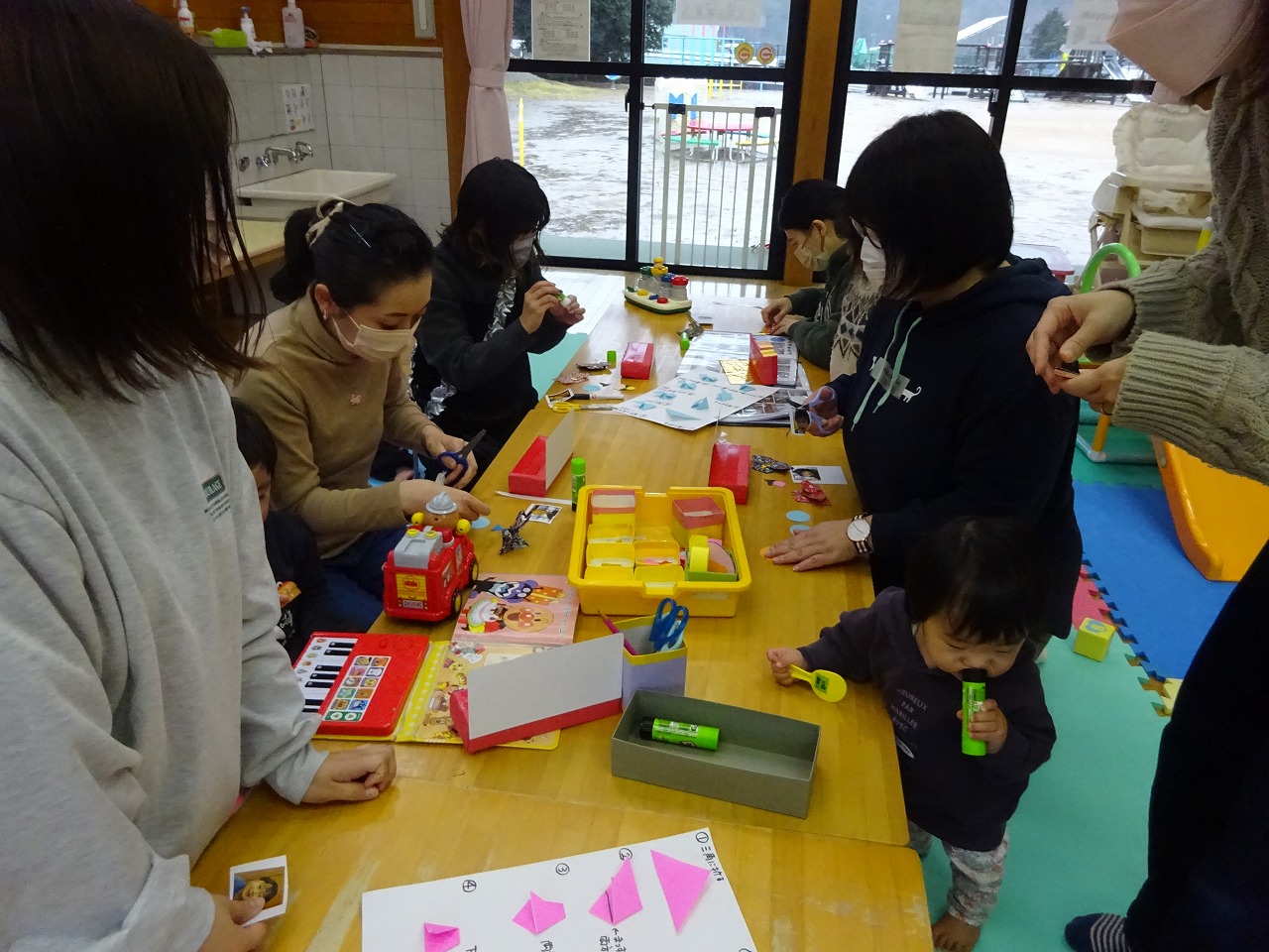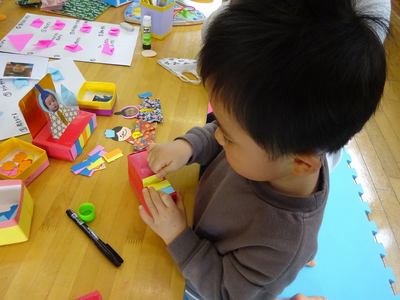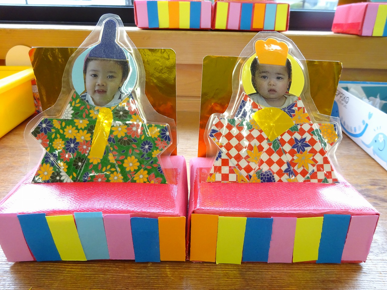 2日間で11組の親子が製作してくれました。台座の模様の色を丁寧に一枚一枚真剣に貼る様子もあり、子どもたちの成長を感じます。姉弟はお内裏様とお雛様に仕上げ、一人のところは顔を描いてお内裏様とお雛様を作り飾ることにしました。子どもたちの顔を貼って着物に添えると凛々しく可愛いおひな様に仕上がりました。ラミネート加工することで長持ちして飾れそうです。フォトコーナーでの写真撮影も何人か撮り、金屏風の前で可愛い写真となりました。