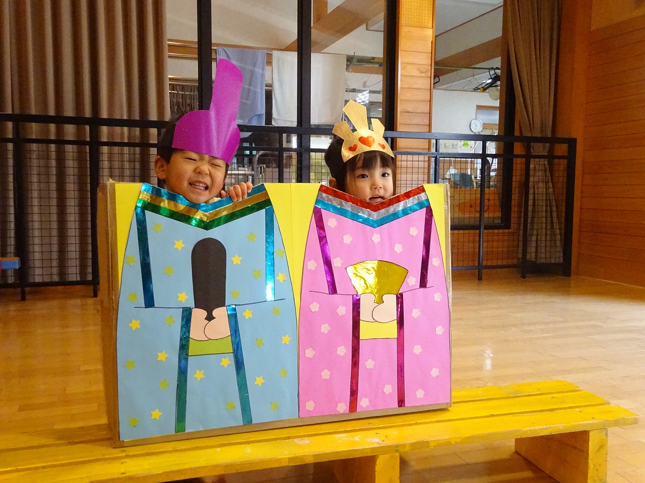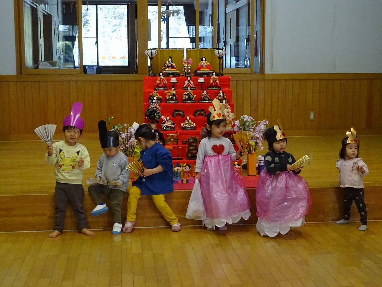 6組の親子とうさぎ組の子どもたちが参加しました。初めにお雛様を見ながら名前やお雛様のことをお話してから(がんどうち)を行いました。子どもたちは「ひなさまみしとくれ」と大きな声で言いお菓子をもらって食べました。食べ終わった後は、ドレスのおひなさま衣装を着てうれしいひなまつりの曲に合わせて踊ったり、顔出しフォトコーナーで写真撮影をして楽しみました。