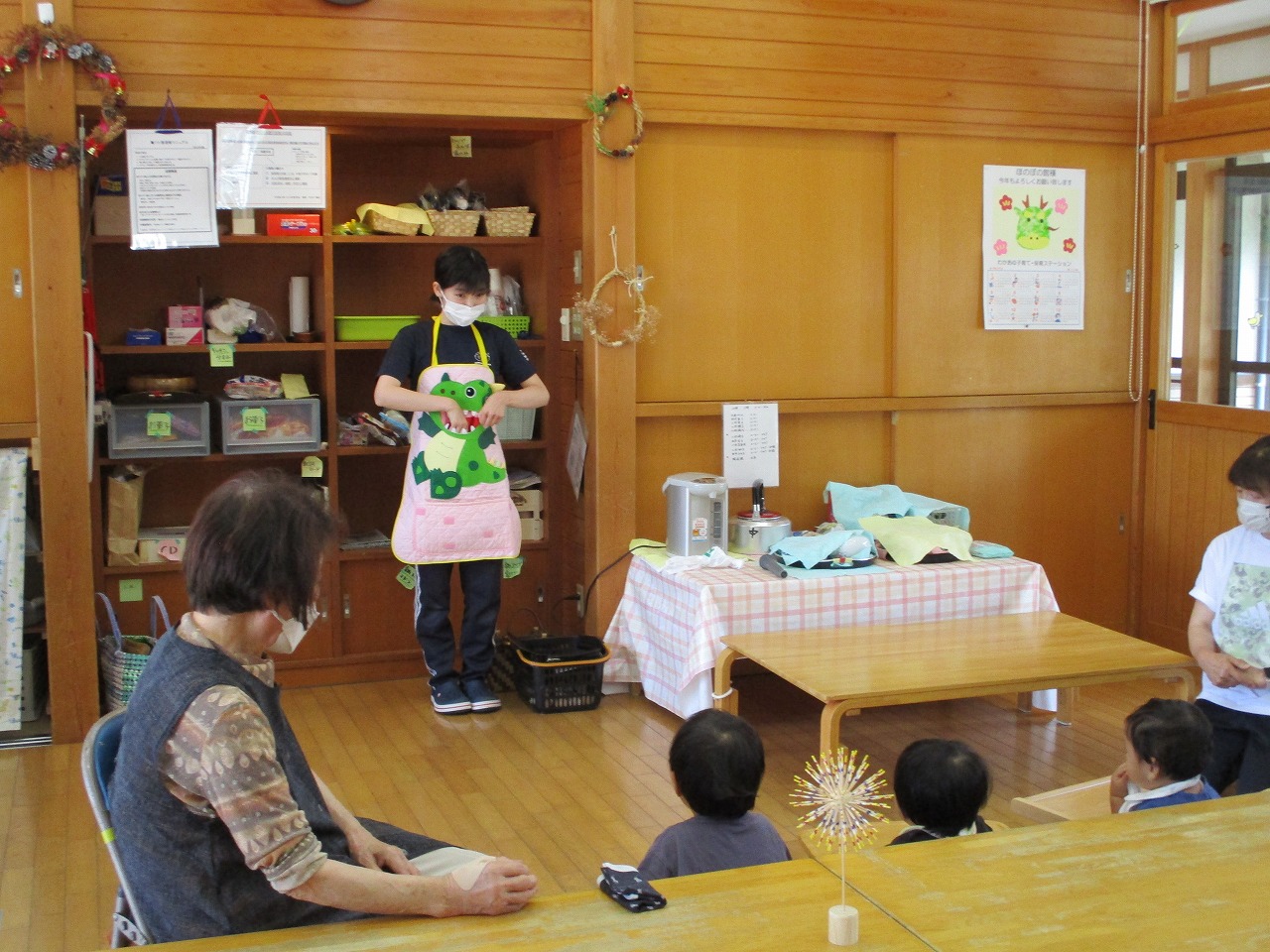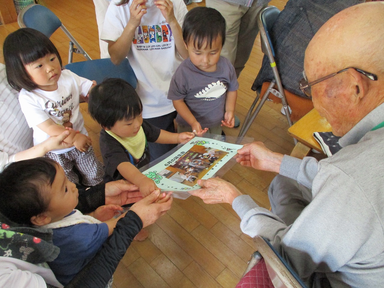 6月生まれのお友だちはいませんでしたが、ほのぼの館の4月生まれのおじいちゃんが前回お休みされていたので今月誕生会をしました。おじいちゃんは「満99歳‼」いつもお元気で散歩にも一緒に行って下さり、子どもたちもおじいちゃんが大好きです。 お楽しみは「はらぺこかいじゅう」のエプロンシアター。なんでも食べちゃうかいじゅうのお話。おもしろそうに見てくれました。