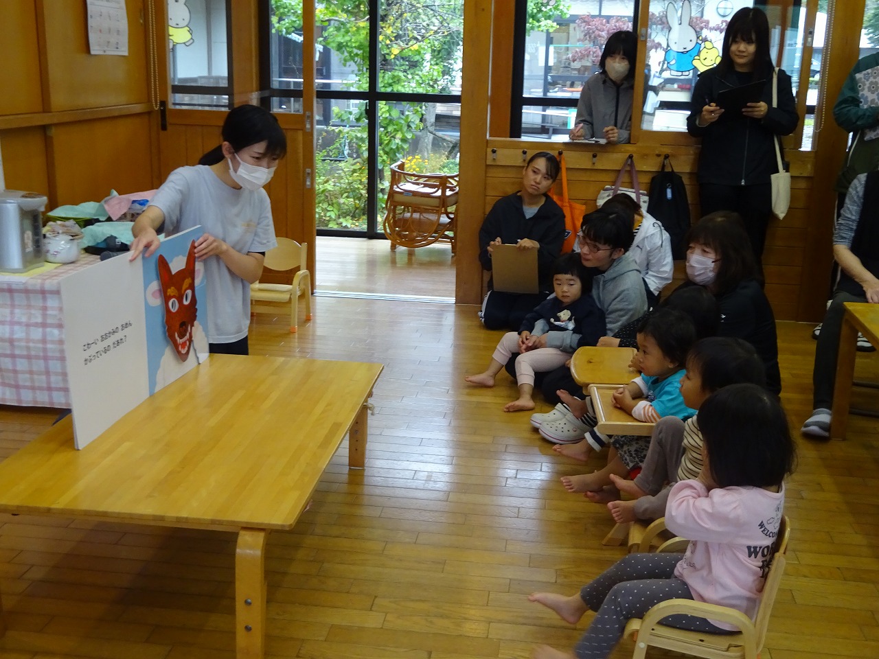 10月生まれは2名のおばあちゃんでした。いつも元気いっぱいのおばあちゃんなのでインタビューもろうそく消しも元気いっぱいで盛り上がりました。お楽しみは「お面です」の大型絵本!いろんなお面がでてきておもしろかったね!
