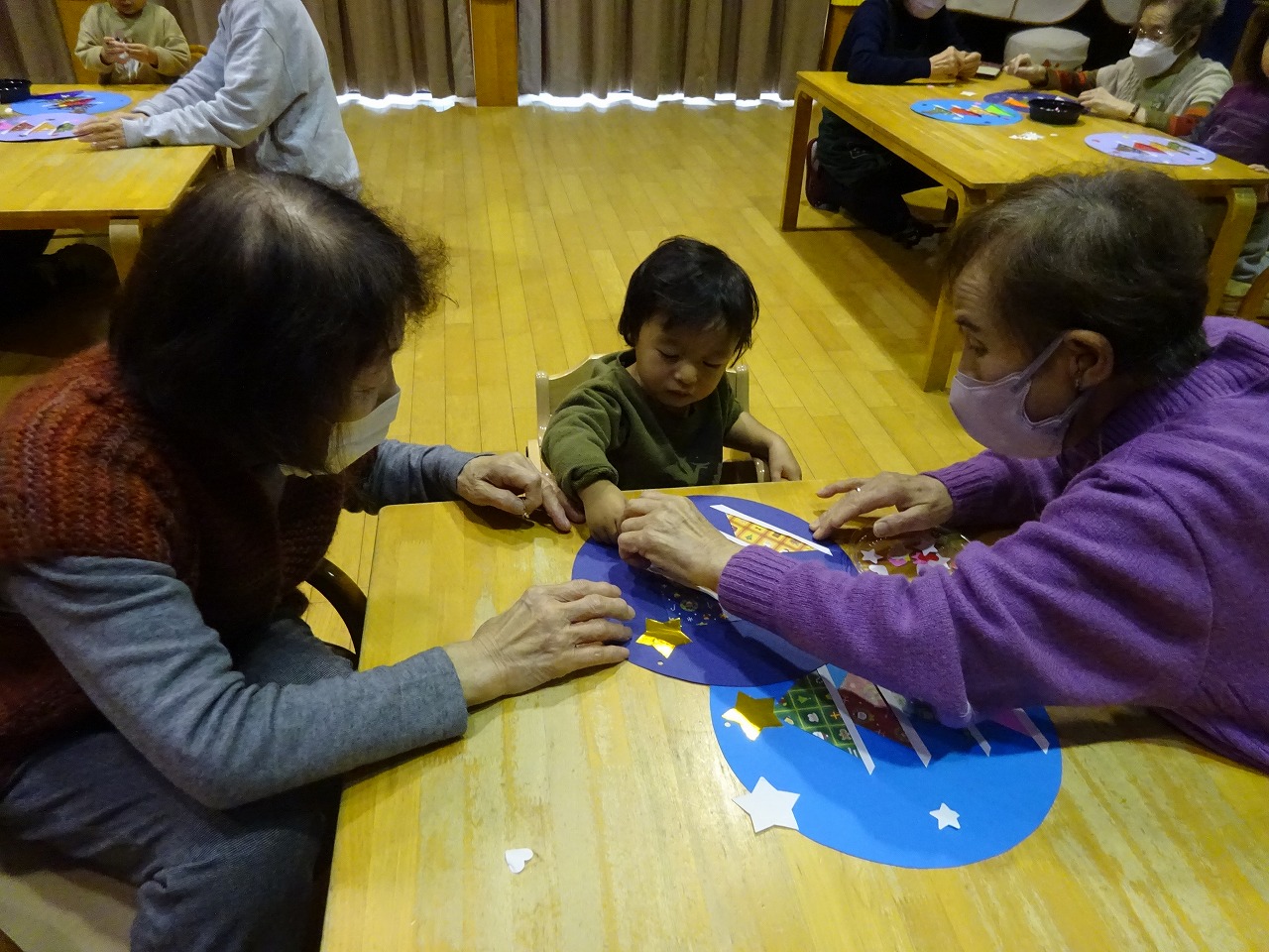 11月のお楽しみ会はもうすぐクリスマス🎄ということで、ほのぼの館の方と一緒にクリスマスツリーの製作をしました。おばあちゃんたちに折り紙を折ってツリーを作ってもらい、子どもたちは星や雪などツリーに飾りを貼っていきました。できあがった作品を遊戯室の壁面に飾り、電飾されたクリスマスツリーを点灯しました。ステキなクリスマスの飾りができました。クリスマス会もほのぼの館の方と一緒に行うことを知らせ、サンタさんが来ることを楽しみに待つ子どもたちでした。
