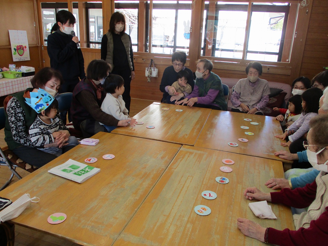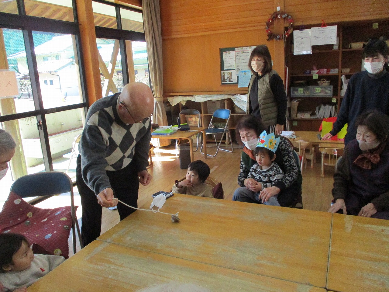 1月生まれのお友だちは1名だったこともあり、ちょっぴり照れていたけどインタビューやろうそく消しを友だちや保育士と一緒にがんばりました!お楽しみは「お正月あそび」かるたをほのぼの館のおばあちゃんたちとペアになってやったり、ひもゴマを回すところを見せてもらったりしました。おばあちゃんたちも子どもの頃に戻ったみたいに一緒にあそんで下さいました。