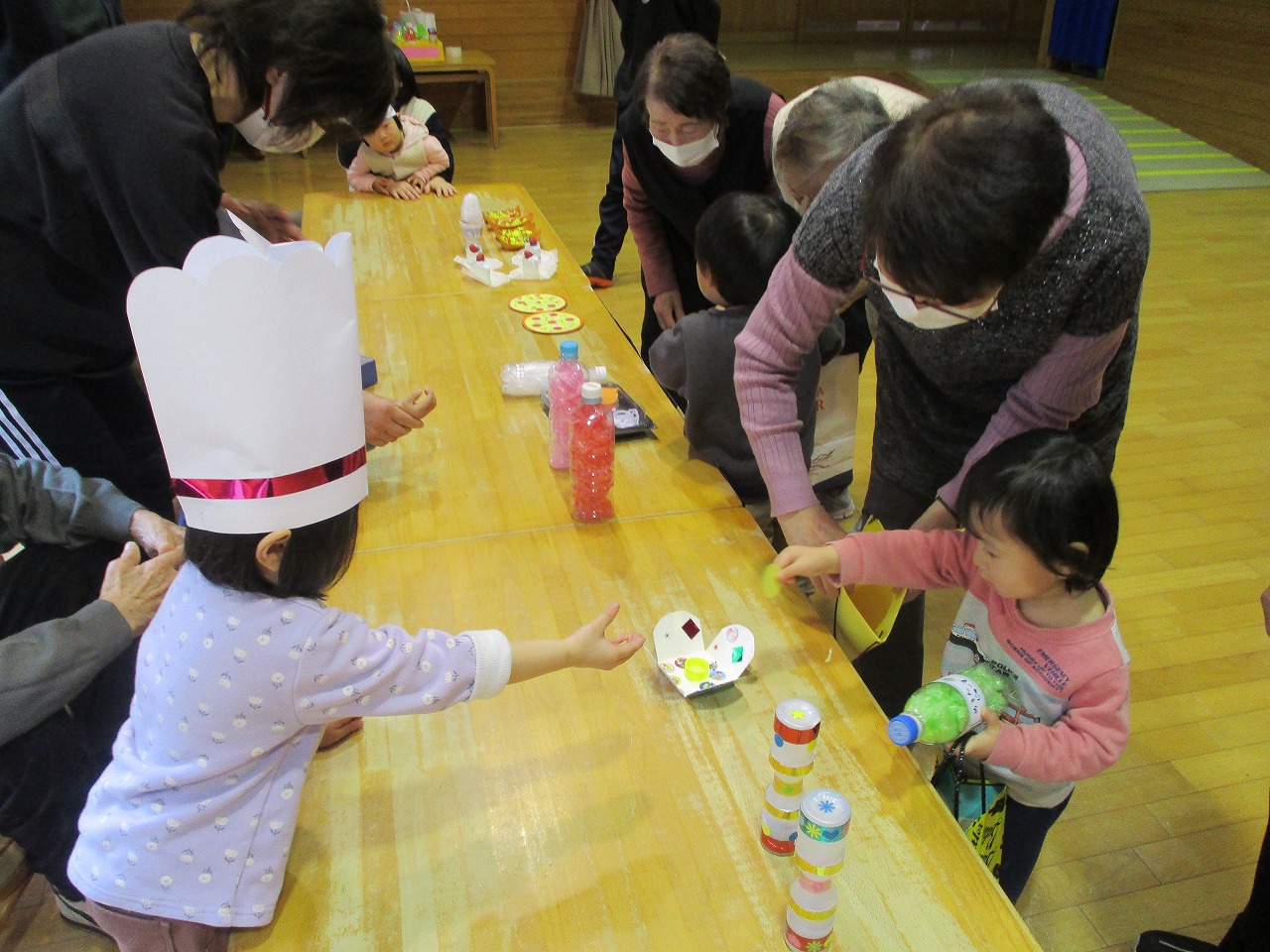 3月は2人のお友だちと2人のおばあちゃん、4名がお誕生日でした。インタビューやろうそく消し、みんなで盛り上がりました! お楽しみは「おみせやさんごっこ」おばあちゃんたちとグループになってお店屋さんをしたり、手をつないで買い物に行ったりしました。「いらっしゃいませー」「10円です」などやりとりも上手にでき、おばあちゃんたちも役になりきって楽しんで下さいました。袋いっぱいの品物を買ってうれしそうでした。