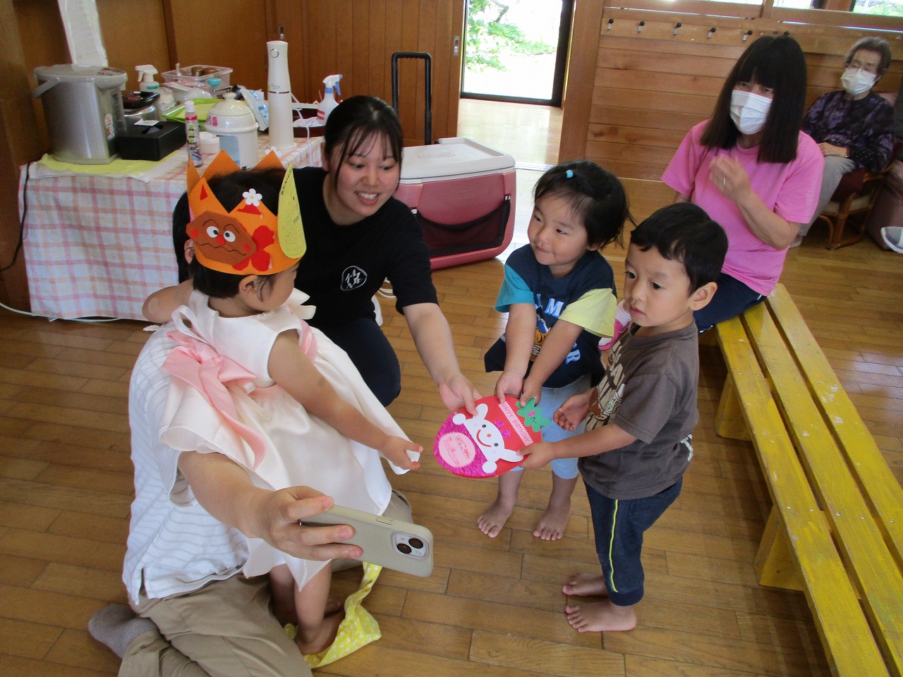 7月生まれは1名のお友だちが3歳になりました。「大きくなったら畑のお仕事をする人になりたいです!」ステキな夢を話してくれました。お楽しみは大型絵本「ありとすいか」の話をみんなで楽しく見た後、かき氷を作って食べました!おじいちゃんおばあちゃんと「冷たーい‼」と言いながら大喜びで食べていました。