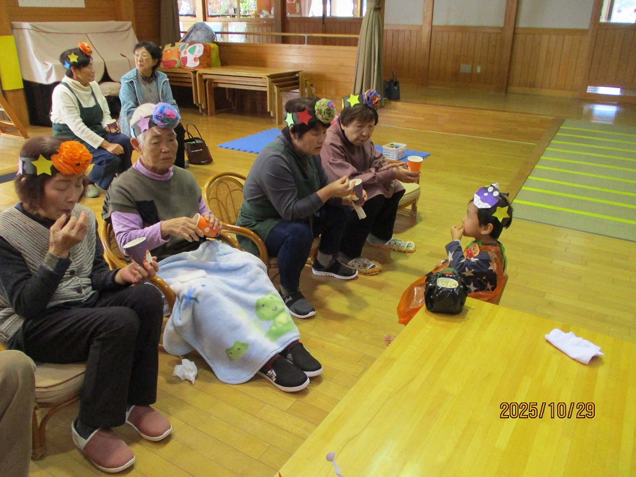 ほのぼの館の方とハロウィンパーティーをしました。子どもたちはかわいいかぼちゃになって「ハッピハッピハロウィーン」のダンスを踊りました♬おばあちゃんたちも一緒に踊ったね!グループになってハロウィーンゲーム(コロコロ転がし・的当て・サーキット)をして最後はにこにこ農園で育てたポップコーンを食べました!にぎやかなパーティーになりました!
