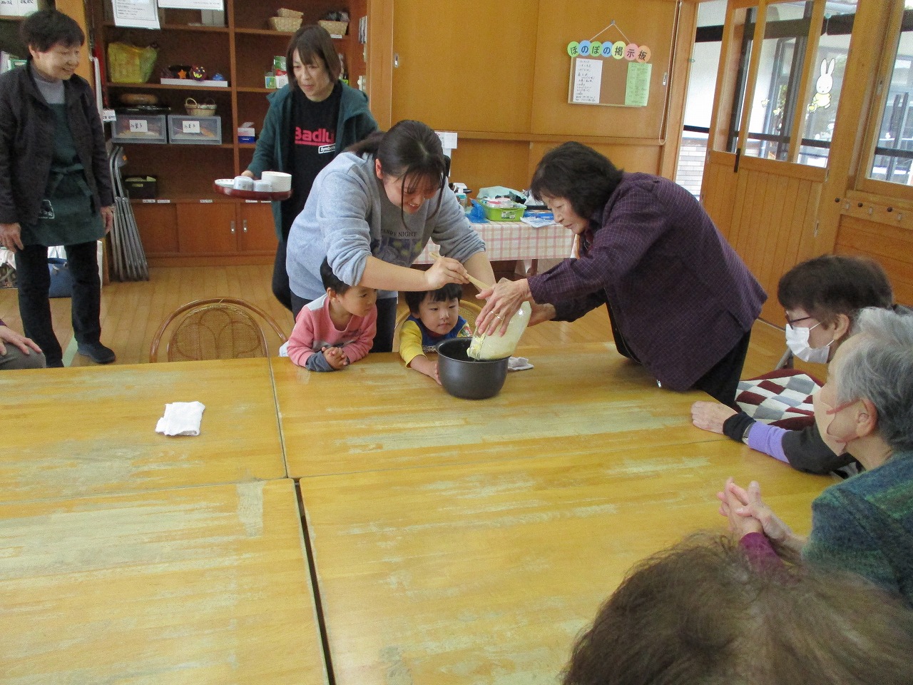 にこにこ農園で育てたさつま芋が10月にたくさん収穫できました。その芋をを使ってほのぼの館の方とケーキを作りました。卵や牛乳を入れたり混ぜたりしてみんなで協力してクッキングをしました。生地を炊飯器に入れて炊くとホカホカのさつま芋ケーキができあがり!!おばあちゃんたちに「おいしい〜」と喜んでもらえて楽しいクッキングになりました。