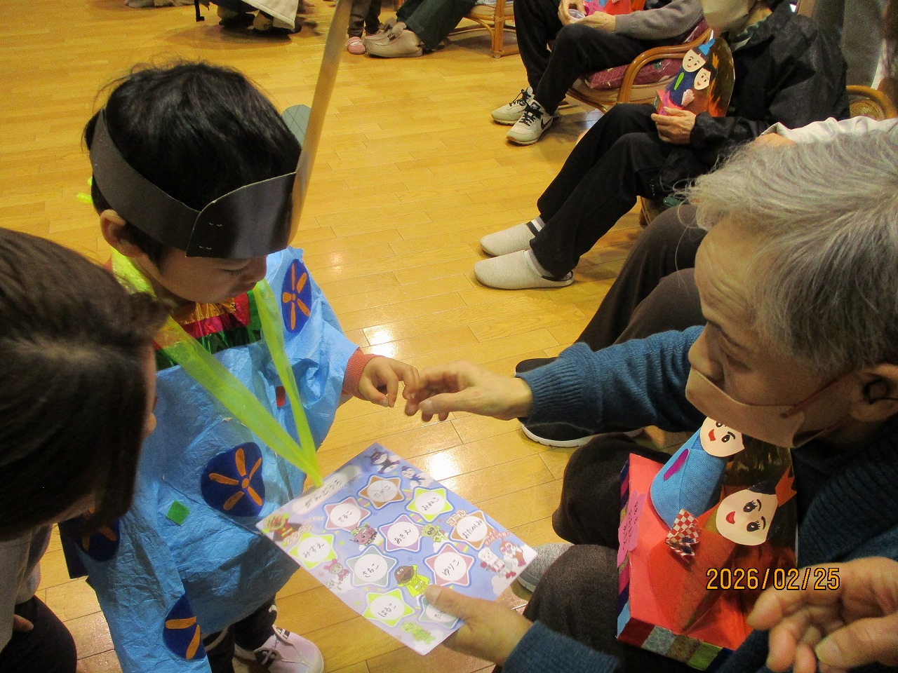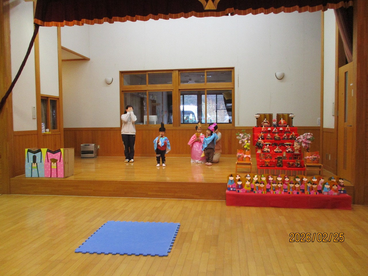 2月になってひなさまを子どもたちもおばあちゃんたちも作り始めました。頑張って作ったひなさまをわかあゆのひなさまと一緒に遊戯室に飾ってみんなでひなまつり会をしました。おだいりさまとおひなさまの衣装を着て「うれしいひなまつり」の踊りをみんなで踊りました。おばあちゃんたちの作ったひなさまを「ひなさまみしとくれ〜」と一人ひとり見に行き、シールをもらって楽しいシールラリーをして盛り上がりました。