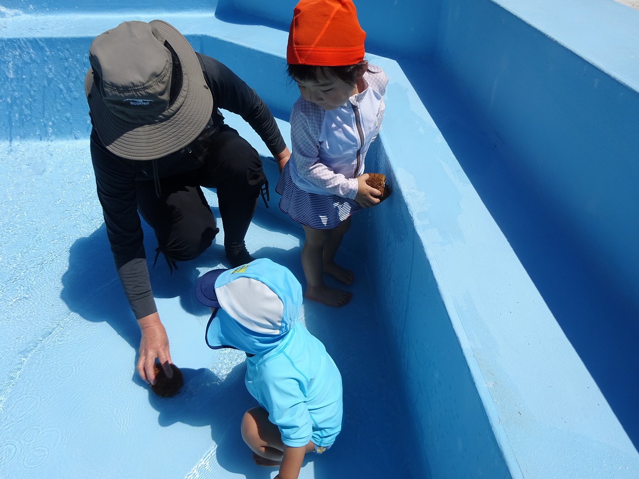 園児用プールの掃除とプールあそびを行いました。