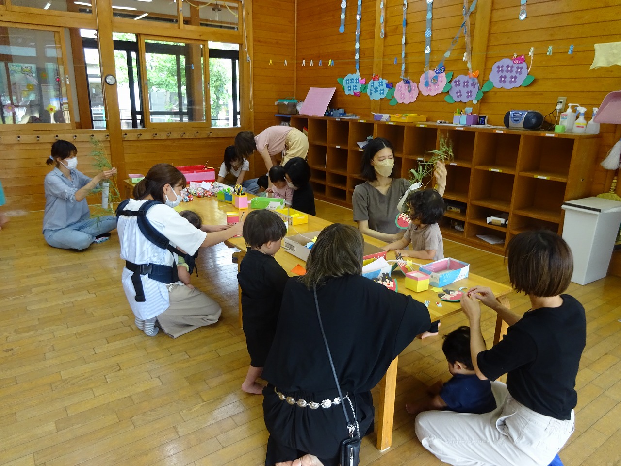 笹に飾り付けをしてから遊戯室で七夕会を行いました。